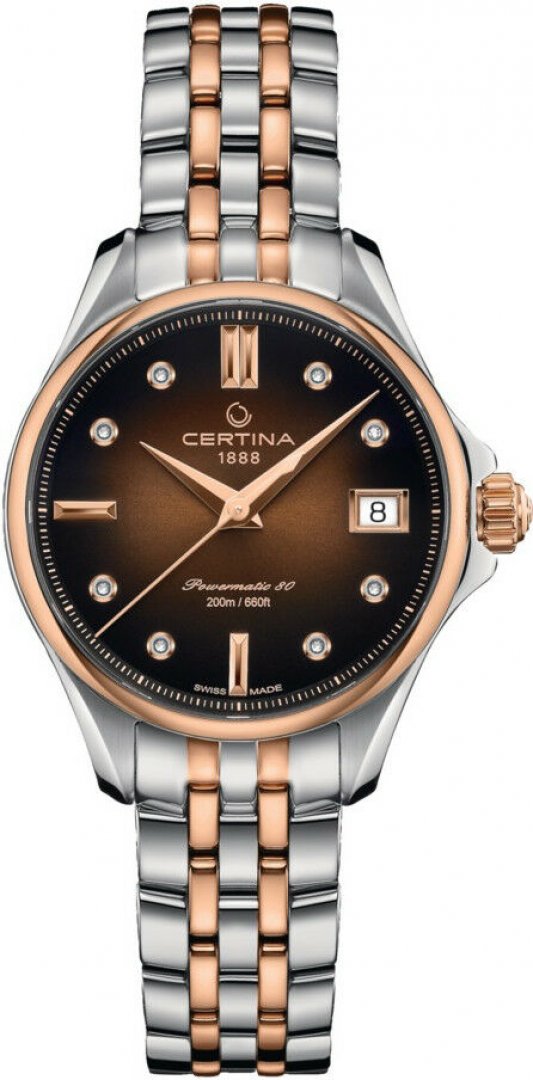 luxury watches Certina DS Action Diamonds, Automatic, 34.50 mm. The watch has functions date . Basic parameters of the watch are: movement type is mechanical watch with automatic winding, strap material is steel, water resistance is 200 m and dial colour is brown.