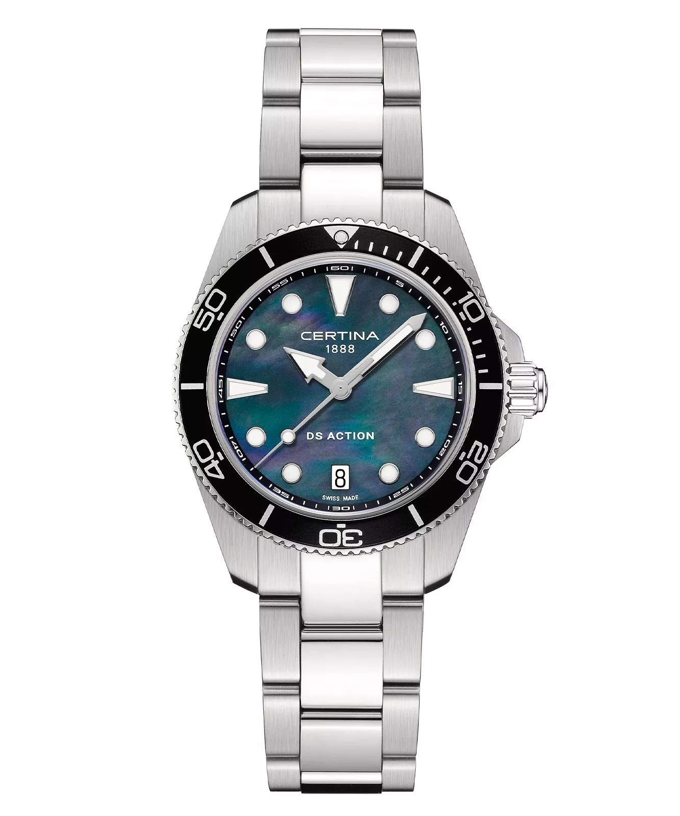 luxury watches Certina DS Action Quartz, Water resistance 300M, 34.5 mm. The watch has functions luminescence, date and E.O.L.. Basic parameters of the watch are: dial colour is pearl, movement type is Quartz watches, strap material is steel and water resistance is 300 m.
