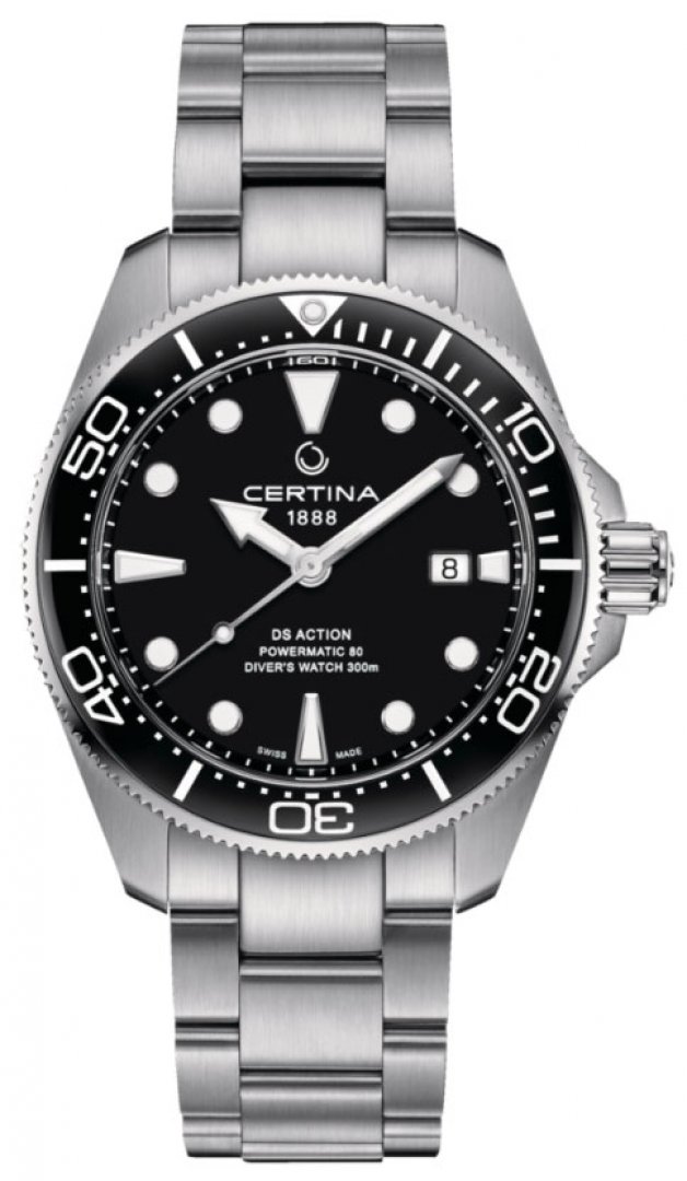 luxury watches Certina DS Action Diver Powermatic 80, Water resistance 300M, 43 mm. The watch has functions luminescence and date . Basic parameters of the watch are: movement type is mechanical watch with automatic winding, strap material is steel, water resistance is 300 m and dial colour is black.