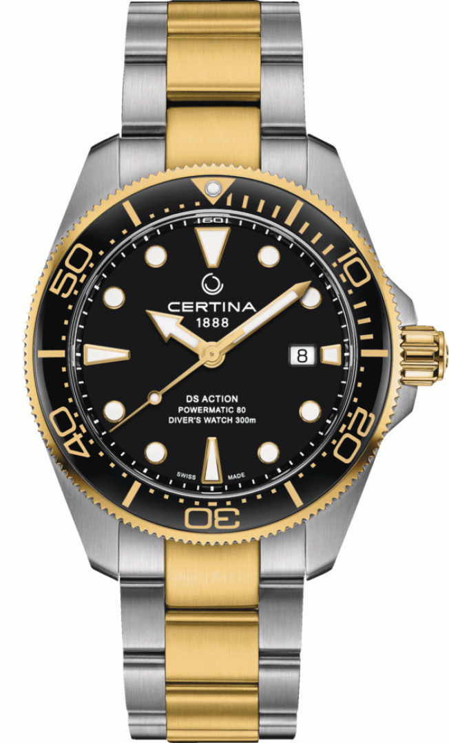 luxury watches Certina DS Action Diver Powermatic 80, Water resistance 300M, 43 mm. The watch has functions luminescence and date . Basic parameters of the watch are: dial colour is black, movement type is mechanical watch with automatic winding, strap material is steel and water resistance is 300 m.