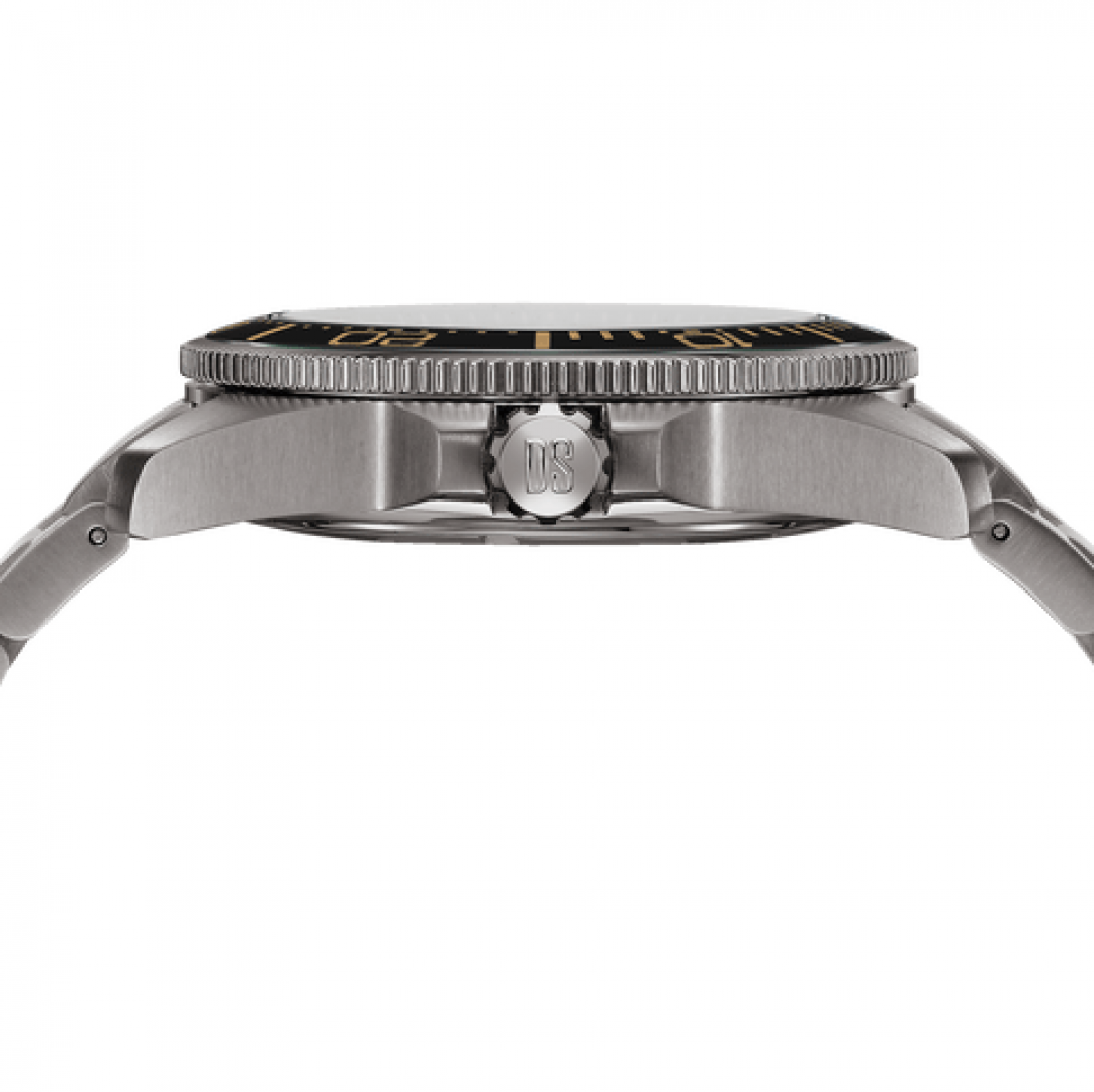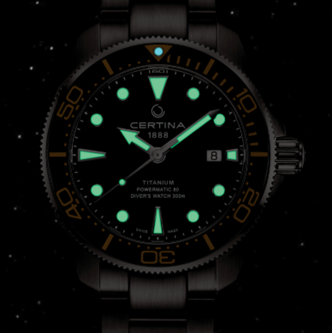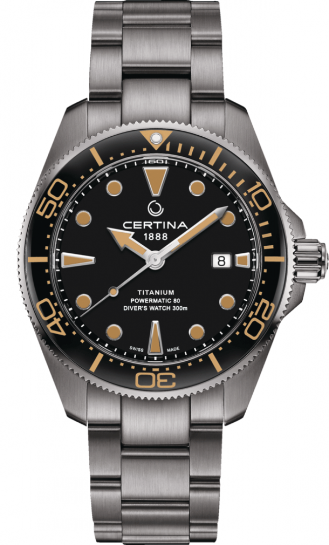 luxury watches Certina DS Action Diver Powermatic 80, Water resistant 300M, 43 mm. The watch has functions luminescence and date . Basic parameters of the watch are: dial colour is black, movement type is mechanical watch with automatic winding, strap material is titanium and water resistance is 300 m.