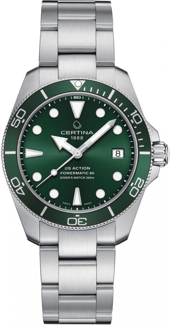 luxury watches Certina DS Action Diver Automatic, Water resistance 300M, 38 mm. The watch has functions luminescence and date . Basic parameters of the watch are: dial colour is green, movement type is mechanical watch with automatic winding, strap material is steel and water resistance is 300 m.