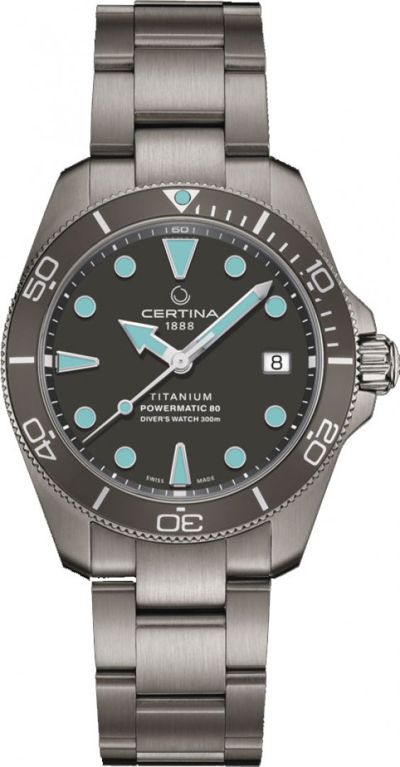 luxury watches luxury watches Certina DS Action Diver Powermatic 80, Water resistance 300M, 38 mm. The watch has functions luminescence and date . Basic parameters of the watch are: movement type is mechanical watch with automatic winding, water resistance is 300 m, dial colour is grey and strap material is titanium.