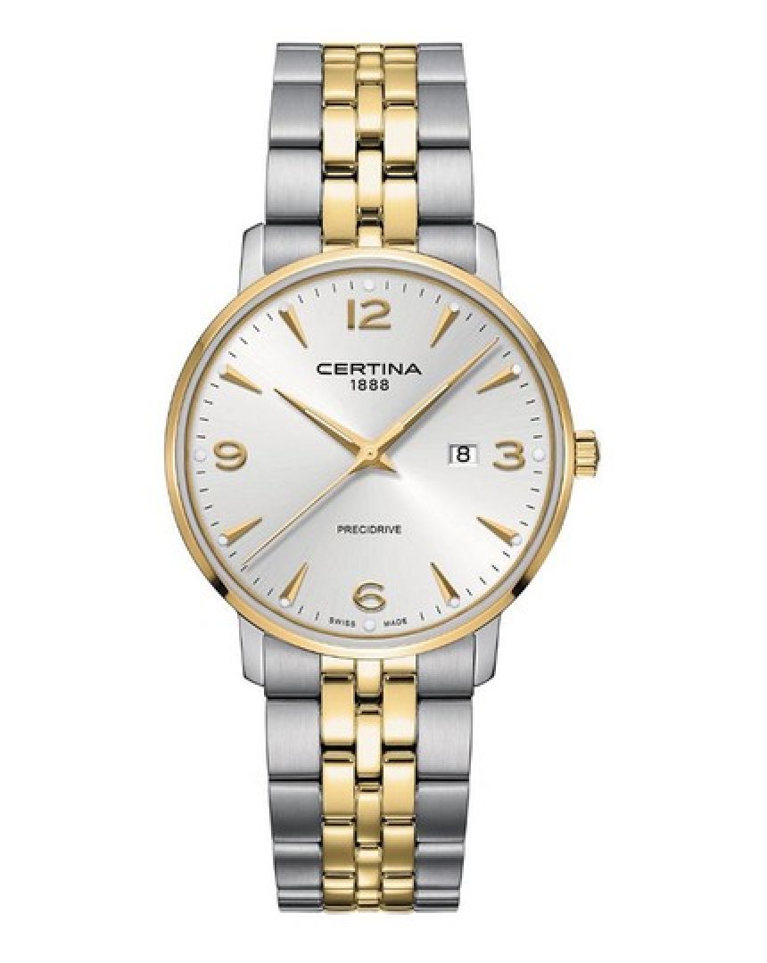 Luxury watches Certina DS Caimano . The watch has functions date and E.O.L.. Basic parameters of the watch are: dial colour is silver, movement type is Quartz watches, strap material is steel and water resistent is 100 m.