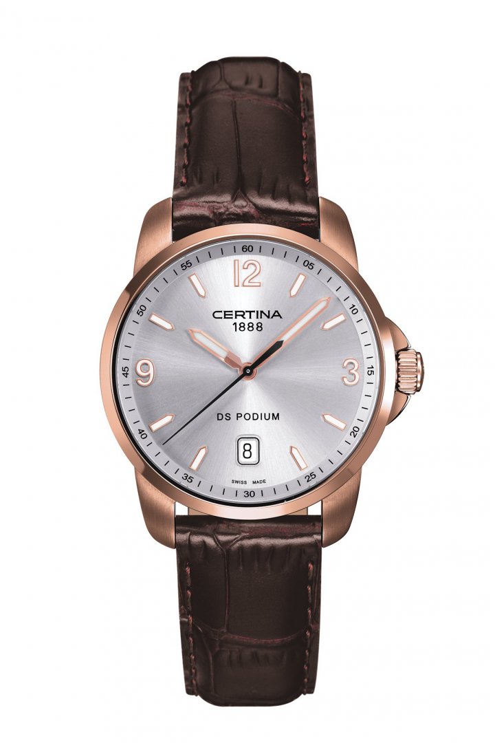 Sport watches Certina DS Podium Water resistance 100M, Quartz, 38 mm. The watch has functions luminescence, date and E.O.L.. Basic parameters of the watch are: movement type is Quartz watches, strap material is leather, water resistent is 100 m and dial colour is silver.