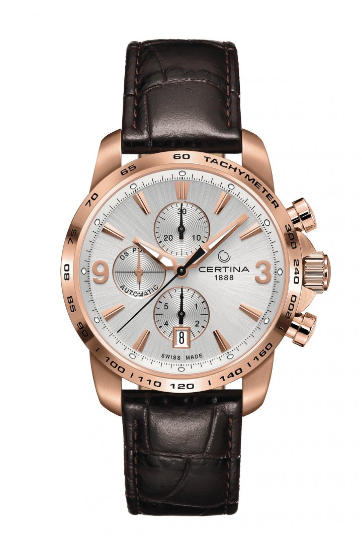 Luxury watches Certina DS Podium Water resistance 100M, Automatic Chronograph,42 mm. The watch has functions luminescence, date , stopwatch and Tachymeter scale. Basic parameters of the watch are: water resistent is 100 m, movement type is mechanical chronograph with automatic winding, dial colour is silver and strap material is leather.
