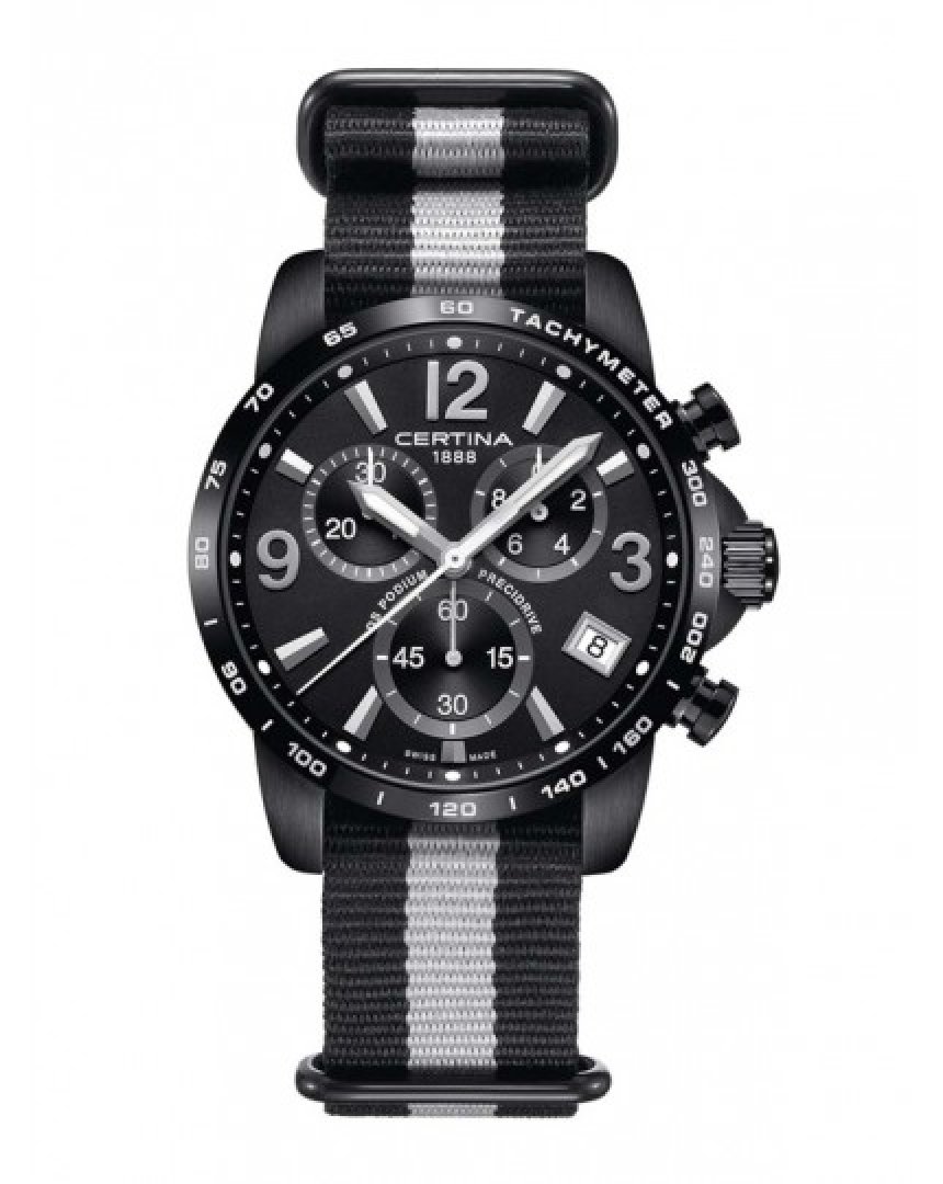 Luxury watches Certina DS Podium Precidrive 1/10, Quartz Chronograph, 41 mm. The watch has functions luminescence, stopwatch, Tachymeter scale, date and E.O.L.. Basic parameters of the watch are: movement type is Quartz chronograph, strap material is textiles, water resistent is 100 m and dial colour is grey.