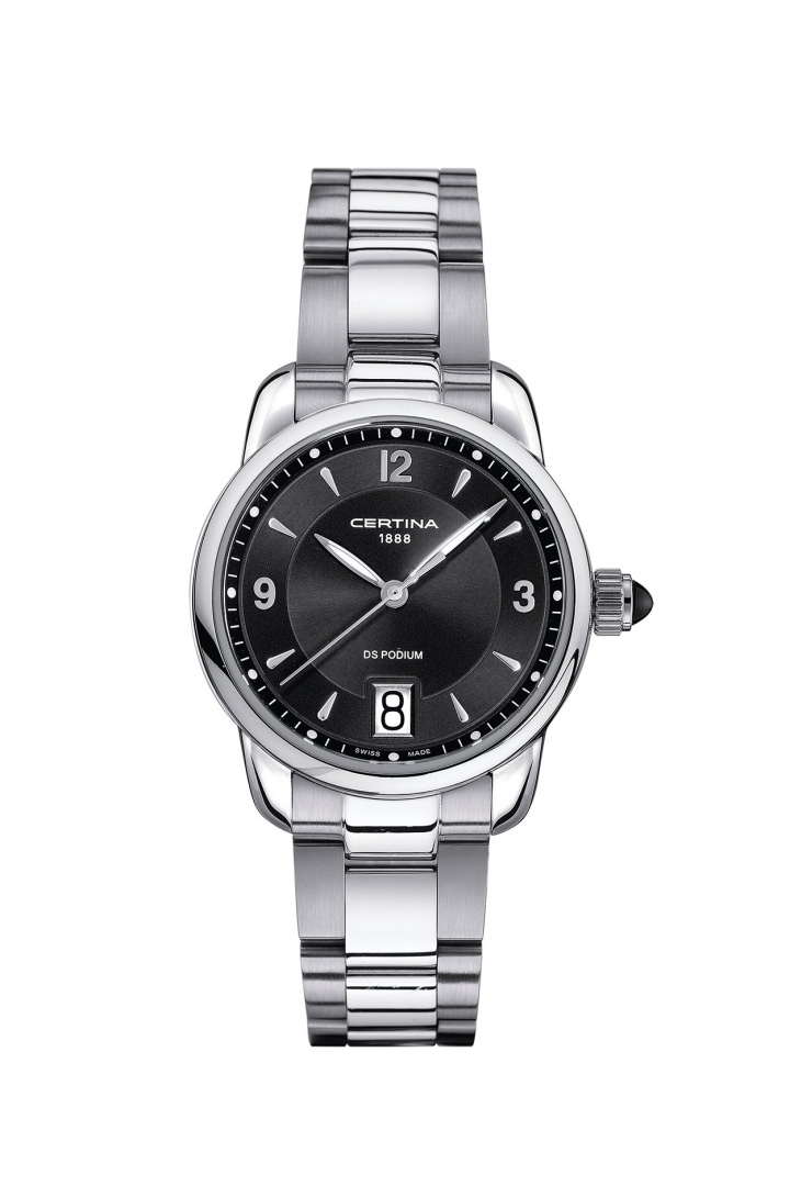 Fashion watches Certina DS Podium Lady Arabic Numerals, Quartz, 32.5 mm. The watch has functions luminescence, date and E.O.L.. Basic parameters of the watch are: dial colour is black, movement type is Quartz watches, strap material is steel and water resistent is 100 m.