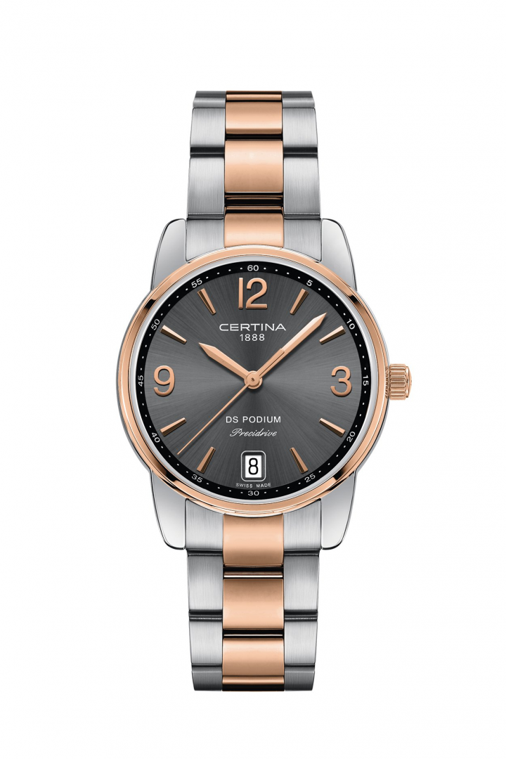 Fashion watches Certina DS Podium Lady Water resistance 100M, Quartz, 33 mm. The watch has functions date and E.O.L.. Basic parameters of the watch are: movement type is Quartz watches, water resistent is 100 m, strap material is steel and dial colour is grey.