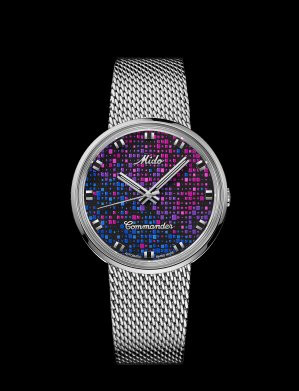 The design of the Commander 1959 perfectly combines the values of the past and present. Vintage-style elements such as the Milanese mesh metal strap and acrylic crystal watch glass are not left out, creating a strong contrast with the modern, colorful pixel graphics and the watch's dynamic impression.