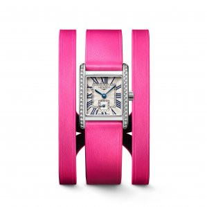 Longines Mini DolceVita with Roman numerals, pink leather strap and Wesselton diamond setting, model number: L5.200.0.71.2