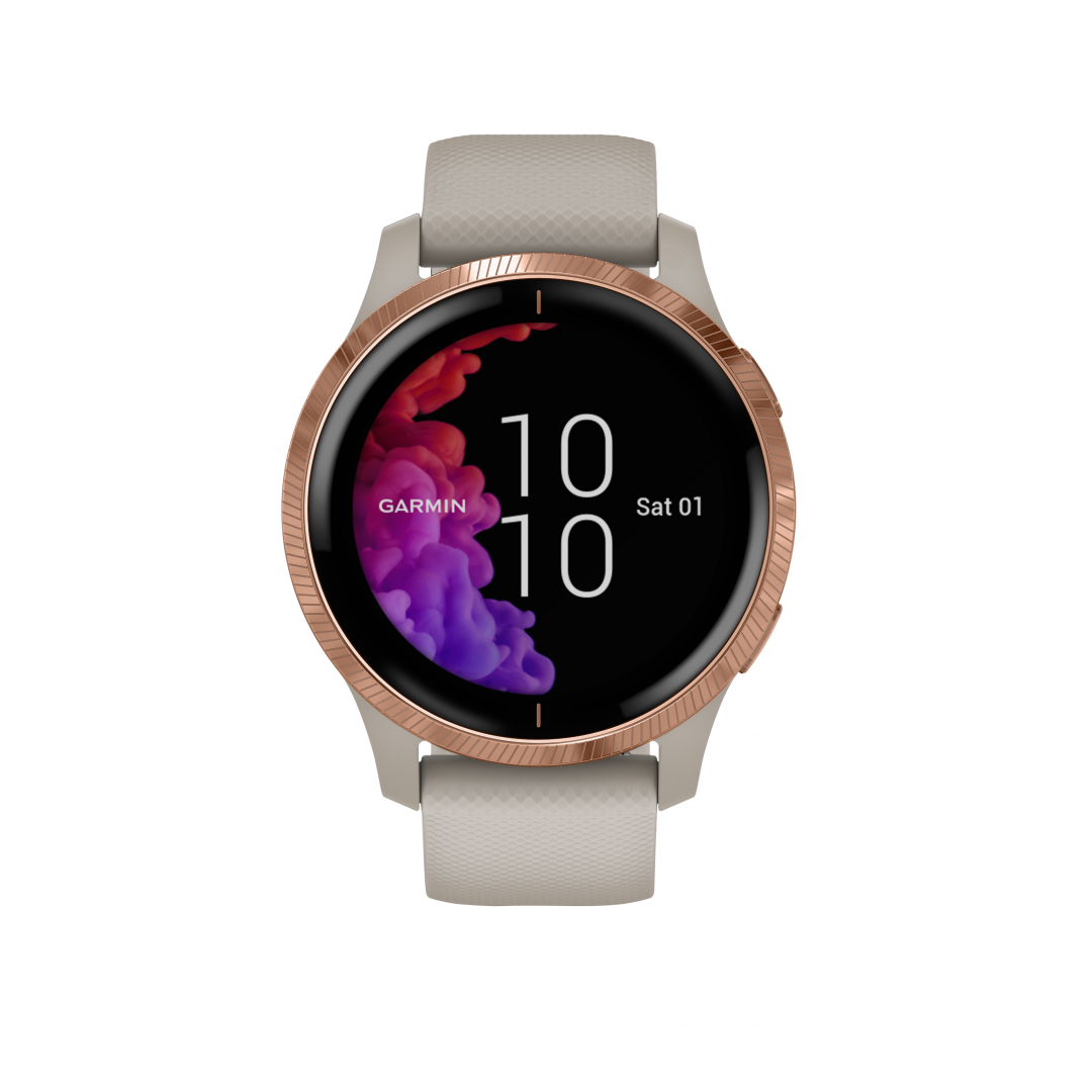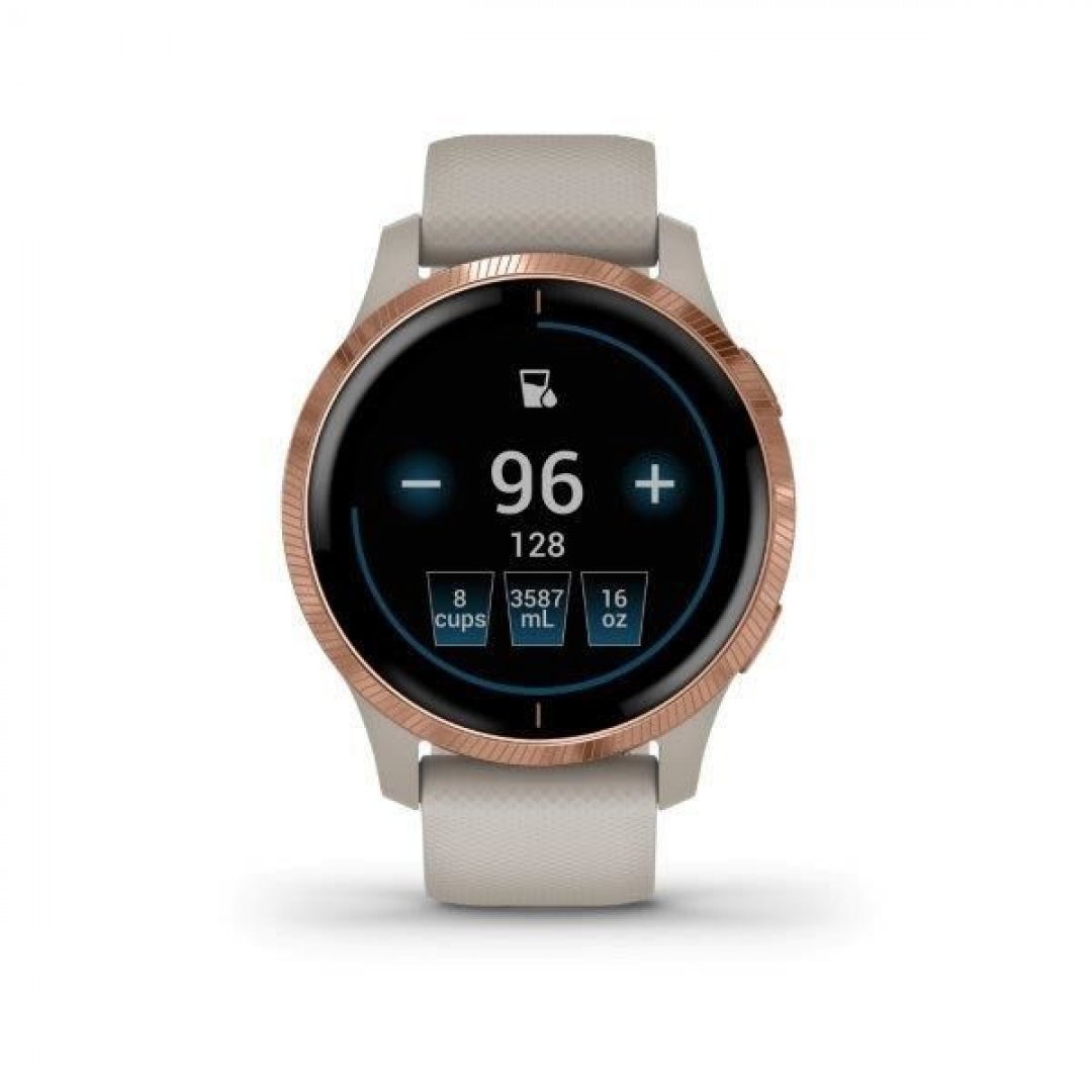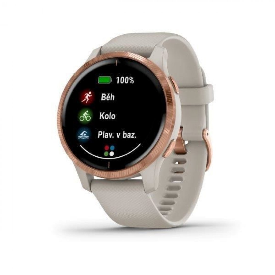 Sport watches fashion watches Garmin Venu RoseGold/Sand 43 mm, Gorilla Glass, Vode odolnosť 50M. The watch has functions alarm, barometer, GPS, heart rate monitor, countdown, stopwatch, world times, training functions, date , altimeter , multifunction, GPS , GLONASS , GALILEO, Akcelerometer, Vysoko-citlivý prijímač, Bluetooth®, MP3 prehrávač, Dotyková obrazovka and Garmin Pay™. Basic parameters of the watch are: movement type is special, strap material is silicone and water resistance is 50 m.