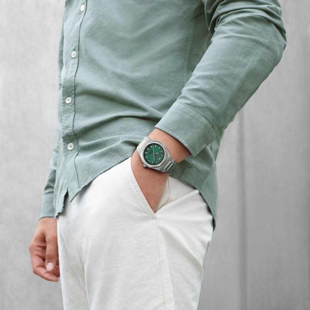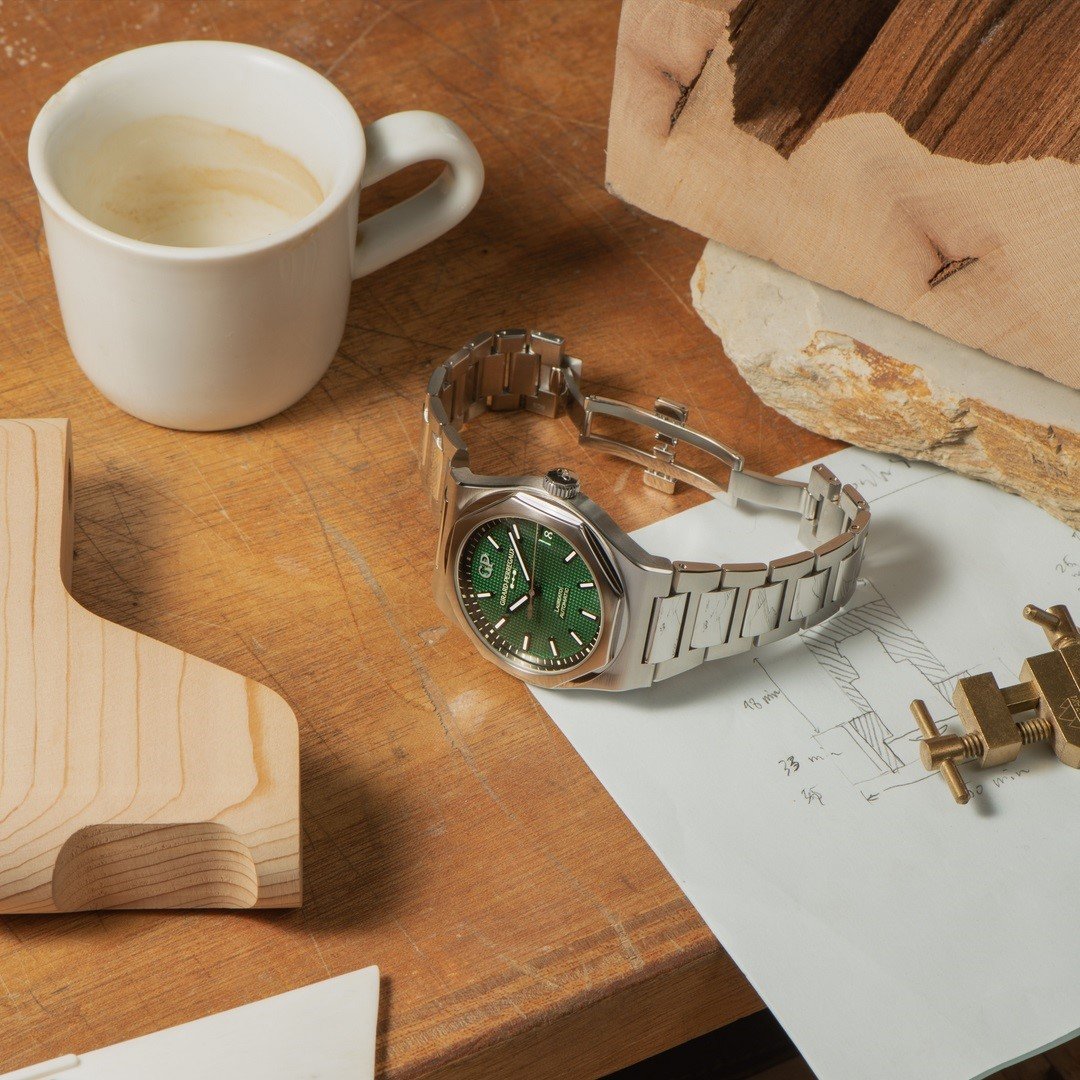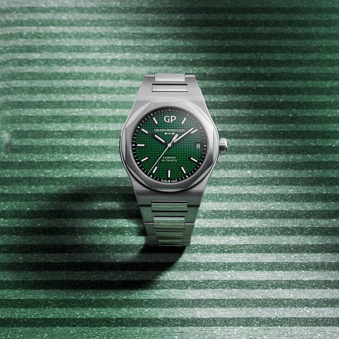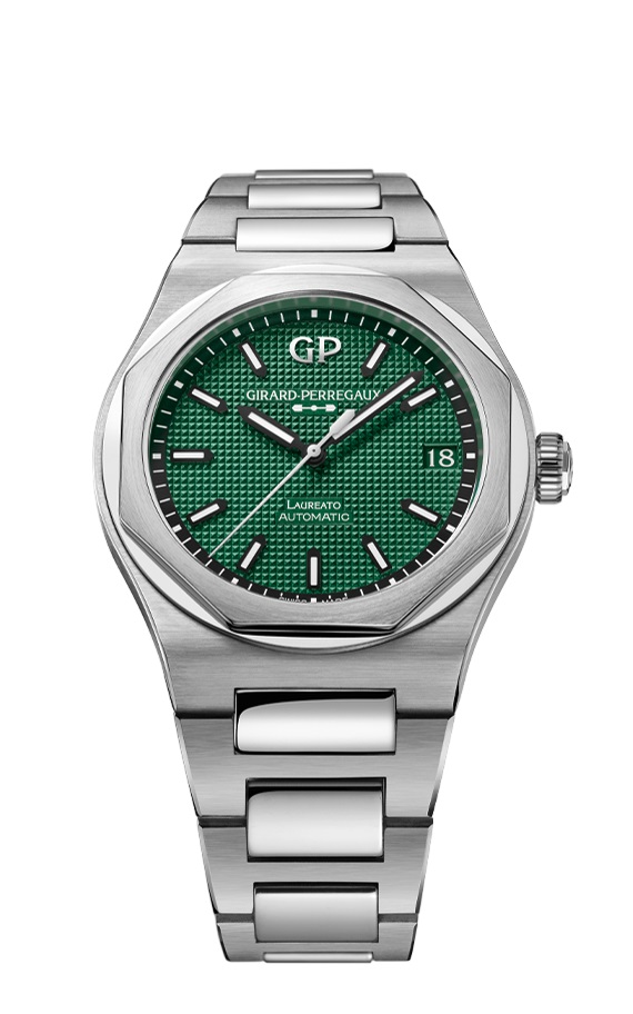 luxury watches Girard-Perregaux Laureato In-House movement, Automatic, 42 mm. The watch has functions date and luminescence. Basic parameters of the watch are: movement type is mechanical watch with automatic winding, strap material is steel, water resistance is 100 m and dial colour is green.