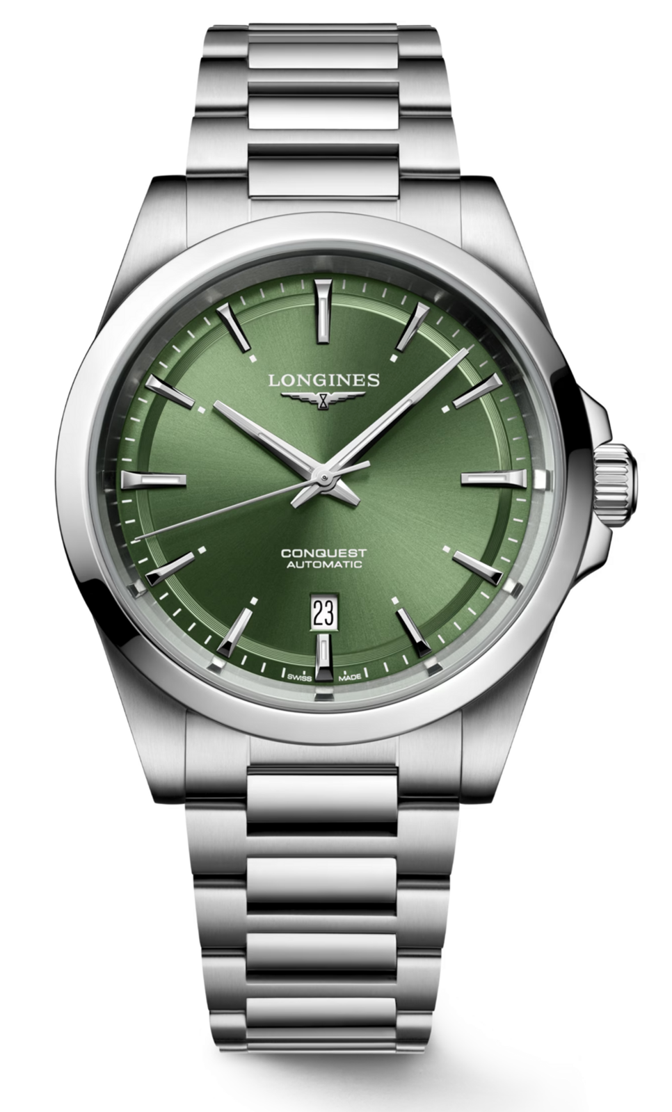 luxury watches Longines Conquest Automatic, 38 mm. The watch has functions date . Basic parameters of the watch are: movement type is mechanical watch with automatic winding, strap material is steel, water resistance is 100 m and dial colour is green.