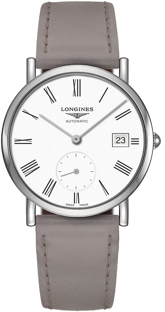 luxury watches Longines Elegance Automatic, 34.5 mm. The watch has functions date . Basic parameters of the watch are: dial colour is white, movement type is mechanical watch with automatic winding, strap material is leather and water resistance is 30 m.