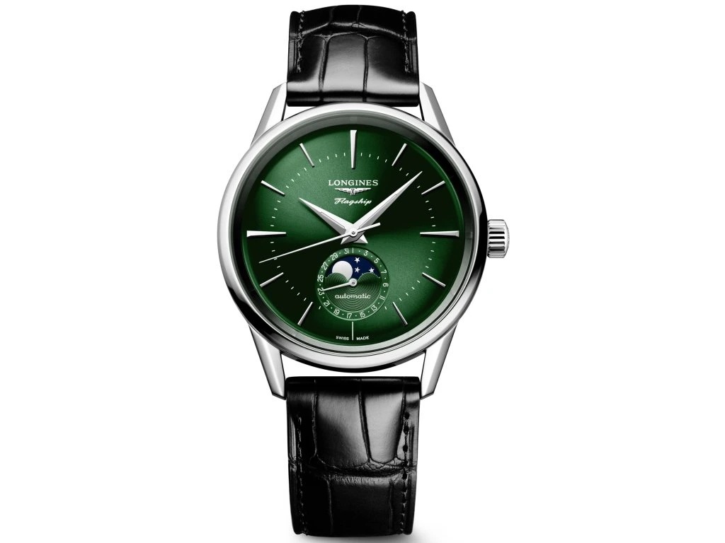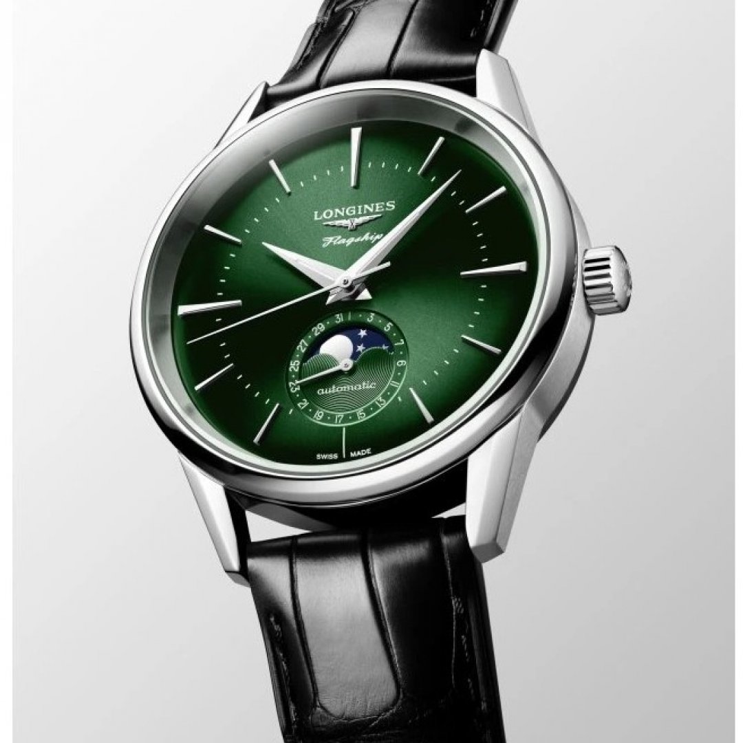 luxury watches Longines Flagship Heritage Automatic, Moon phase, 38.50 mm. The watch has functions moon phases and date . Basic parameters of the watch are: movement type is mechanical watch with automatic winding, strap material is leather, water resistance is 30 m and dial colour is green.