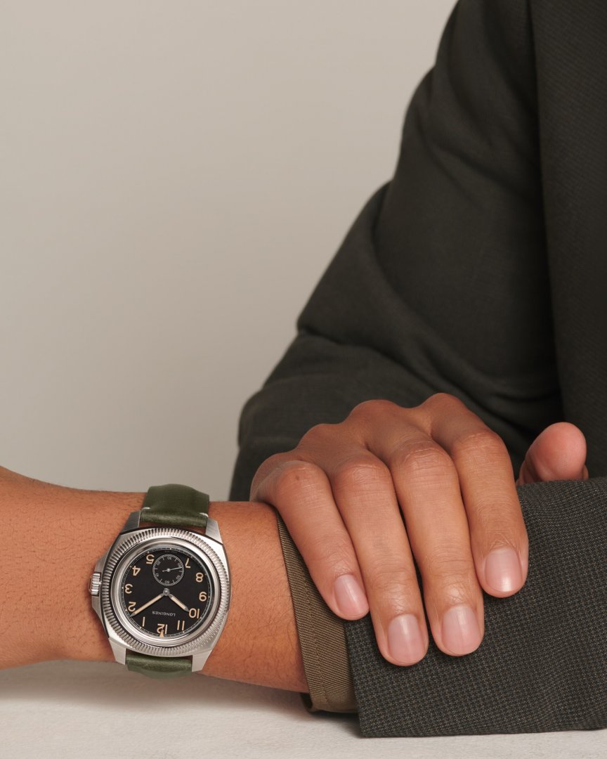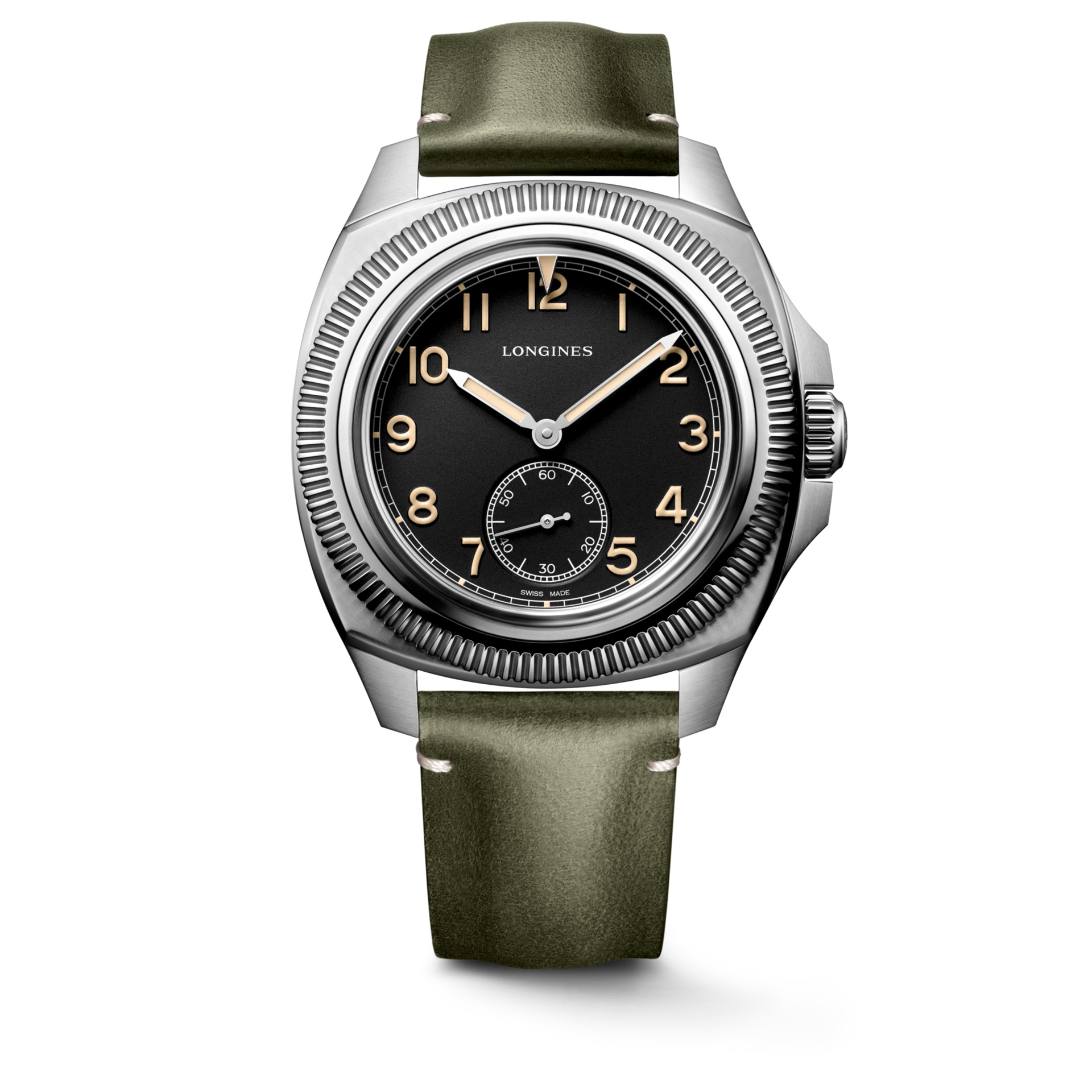 luxury watches Longines Heritage AVIGATION PILOT MAJETEK, Automatic, 43 MM. The watch has functions luminescence. Basic parameters of the watch are: dial colour is black, movement type is mechanical watch with automatic winding and chronometer, strap material is leather and water resistance is 100 m.