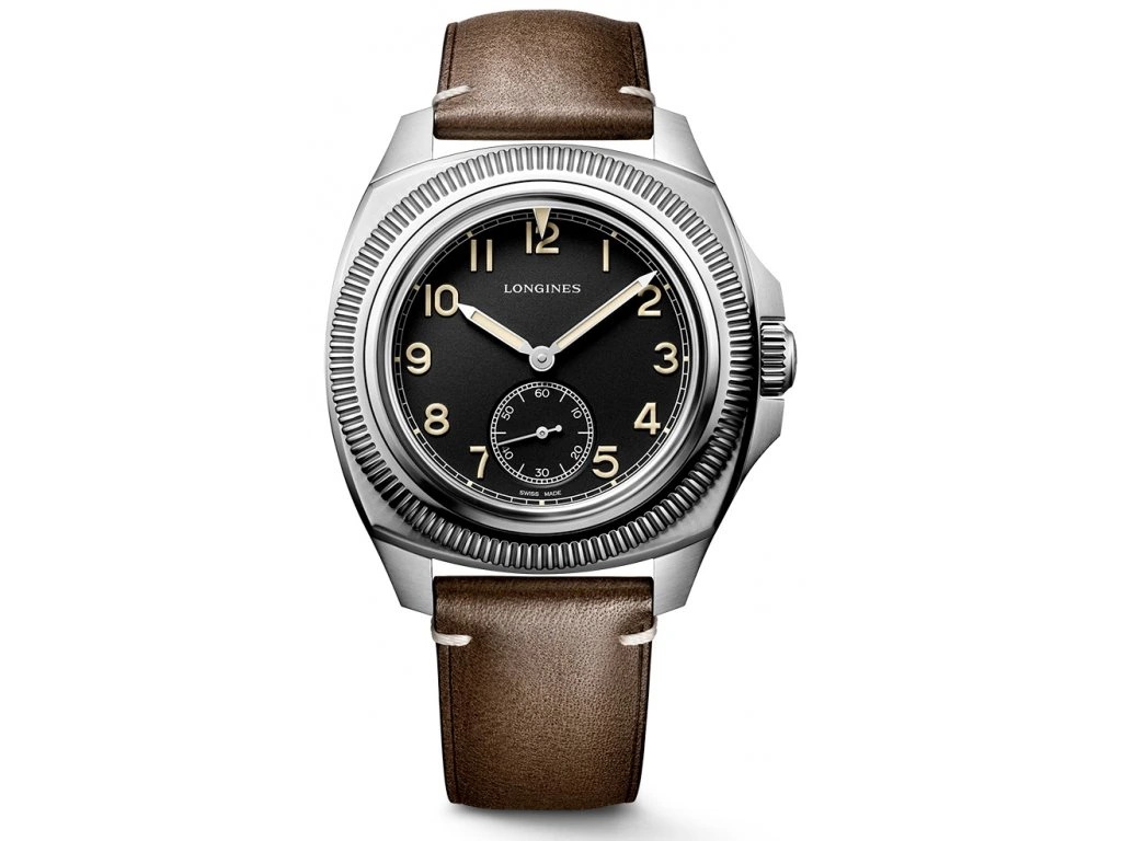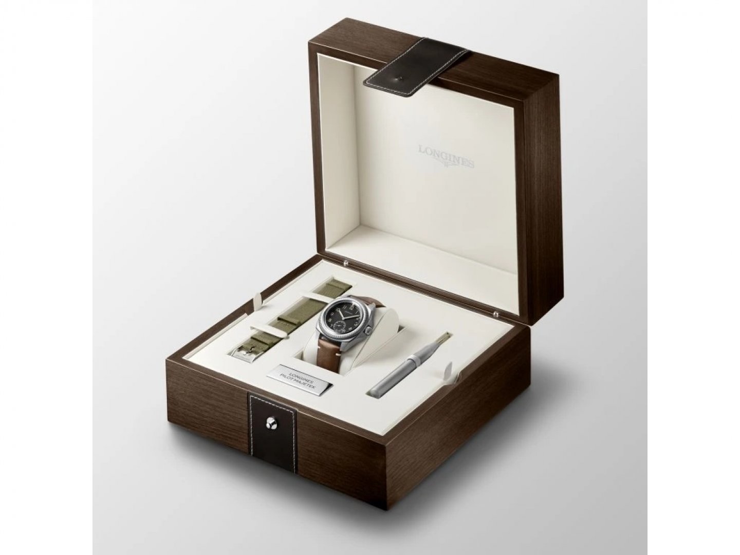luxury watches Longines Heritage AVIGATION PILOT MAJETEK, Automatic, 43 MM. The watch has functions luminescence. Basic parameters of the watch are: dial colour is black, movement type is mechanical watch with automatic winding and chronometer, strap material is leather and nylon and water resistance is 100 m.