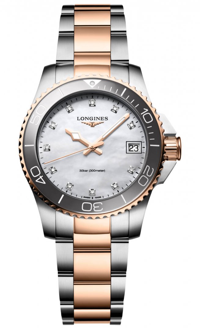 classic watches Longines HydroConquest Diamonds, Quartz, 32 mm. The watch has functions luminescence, date and E.O.L.. Basic parameters of the watch are: dial colour is pearl, movement type is Quartz watches, strap material is steel and water resistance is 300 m.