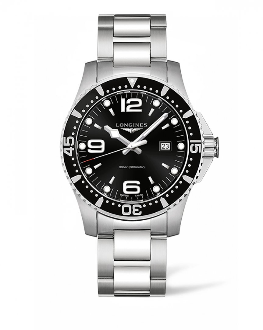Luxury watches Longines HydroConquest Water resistance 300M, Quartz, 44 mm. The watch has functions luminescence and date . Basic parameters of the watch are: dial colour is black, strap material is steel, water resistent is 300 m and movement type is Quartz chronograph.