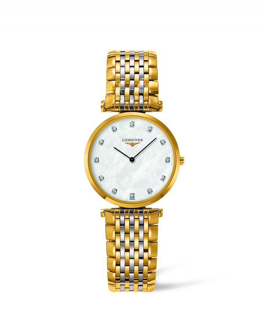 Luxury watches Longines La Grande Classique de Longines Diamonds, Quartz, 29 mm. Basic parameters of the watch are: movement type is Quartz watches, water resistent is 30 m, dial colour is pearl and strap material is steel.
