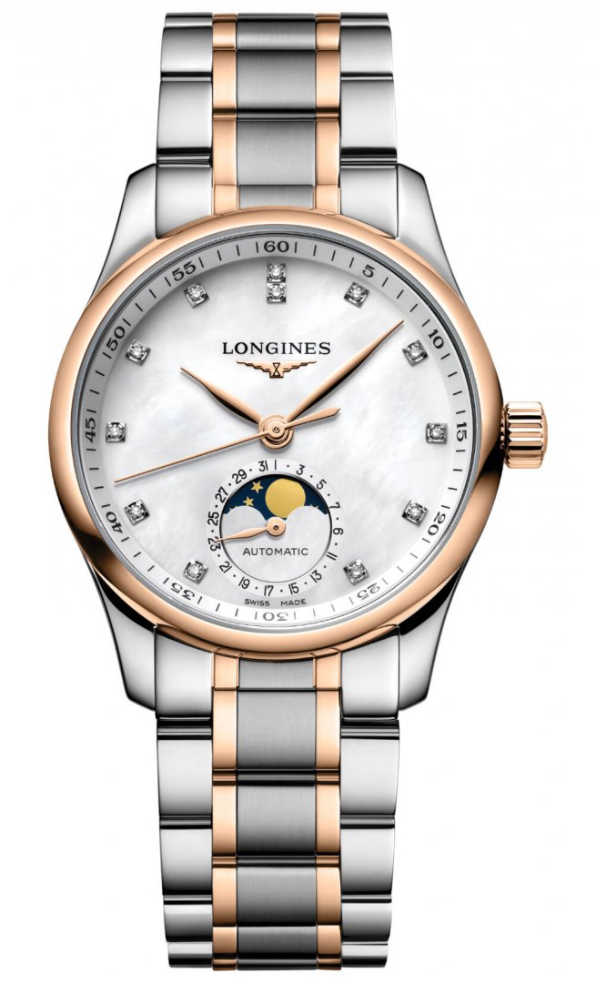 luxury watches Longines Master Collection Diamonds, Automatic, 34 mm. The watch has functions date and moon phases. Basic parameters of the watch are: movement type is mechanical watch with automatic winding, water resistance is 30 m, strap material is steel and dial colour is pearl.
