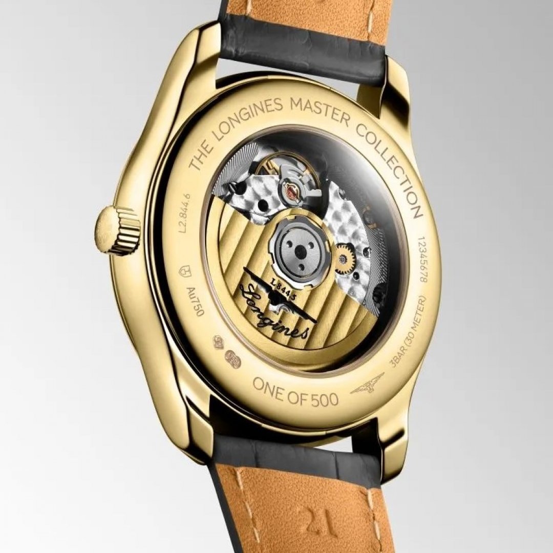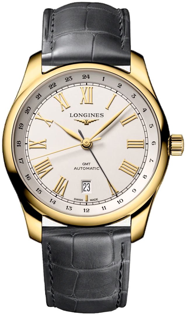luxury watches Longines Master Collection GMT Automatic, 40 mm. The watch has functions dual time and date . Basic parameters of the watch are: dial colour is beige, movement type is mechanical watch with automatic winding, strap material is leather and water resistance is 30 m.