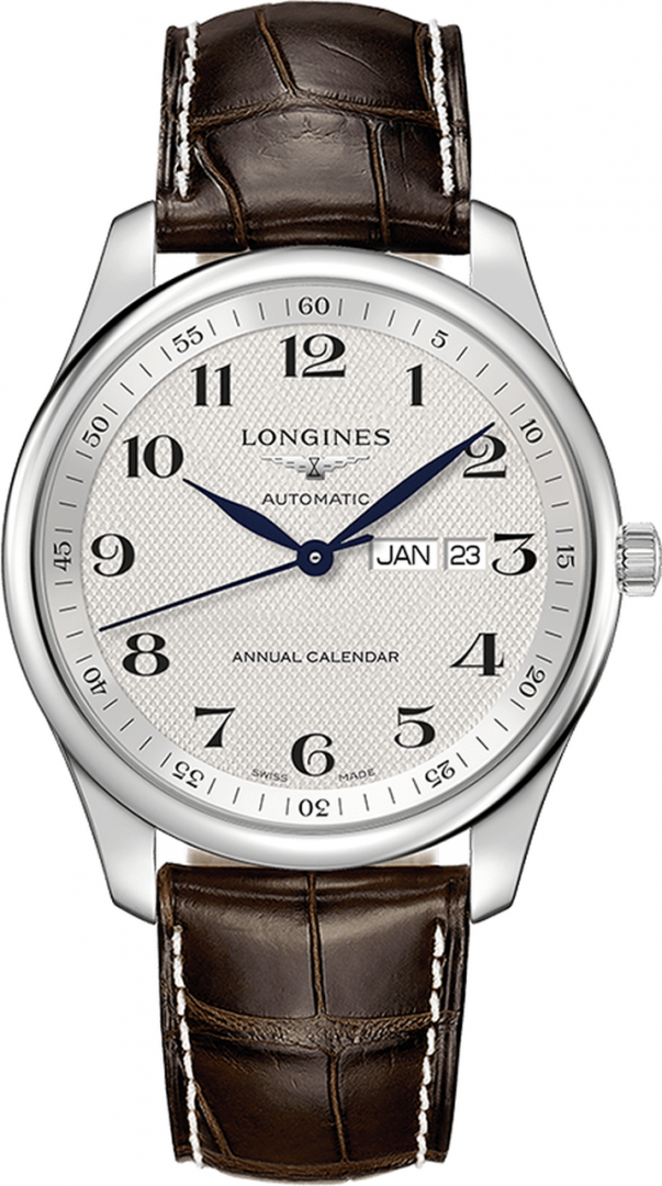 Luxury watches Longines Master Collection Automat, Ročný kalendár, 42 mm. The watch has functions date , annual calendar and Day-Date. Basic parameters of the watch are: movement type is mechanical watch with automatic winding, water resistance is 30 m, strap material is leather and dial colour is beige.