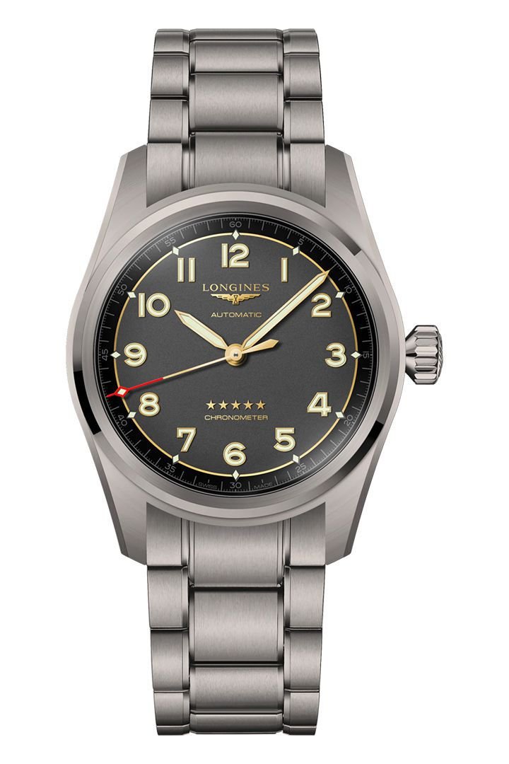 luxury watches Longines Spirit COSC, Automat, 40 mm. The watch has functions luminescence and date . Basic parameters of the watch are: dial colour is black, movement type is mechanical watch with automatic winding, water resistance is 100 m and strap material is titanium.