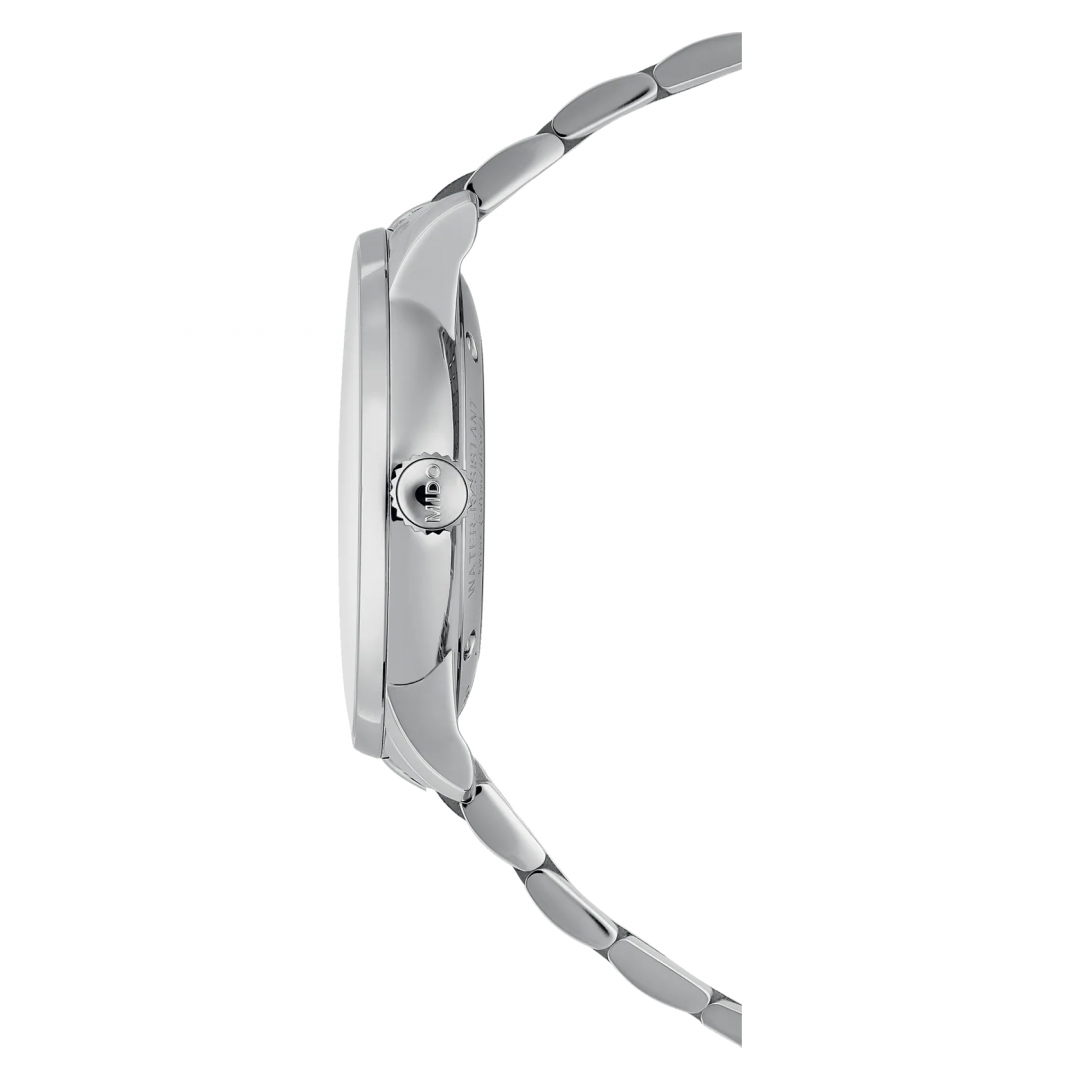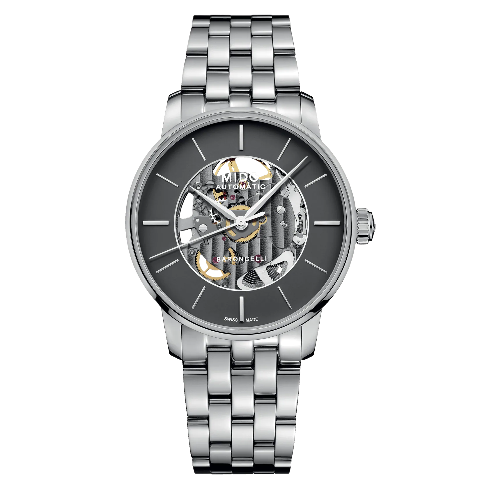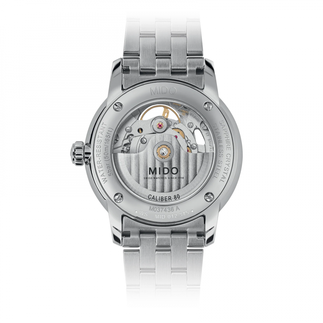 luxury watches Mido Baroncelli Signature Skeleton Automatic, 39 mm. Basic parameters of the watch are: dial colour is transparent and grey, movement type is mechanical watch with automatic winding, strap material is steel and water resistance is 50 m.