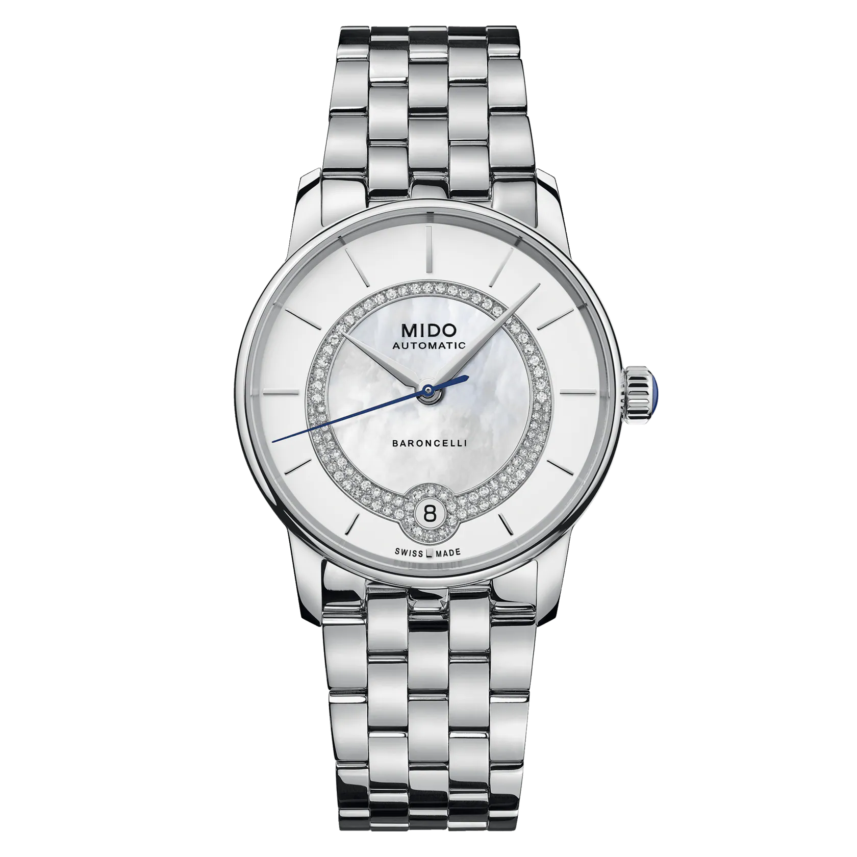 luxury watches Mido Baroncelli Lady Necklace Diamonds, Automatic, 33 mm. The watch has functions date . Basic parameters of the watch are: movement type is mechanical watch with automatic winding, water resistance is 50 m, dial colour is silver and pearl and strap material is steel.