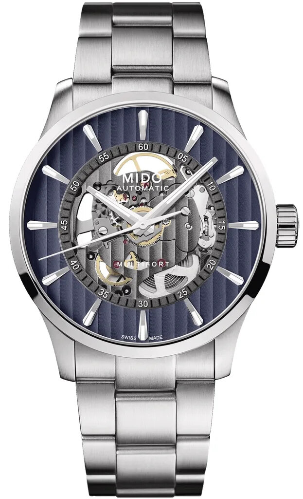 luxury watches Mido Multifort Skeleton Vertigo + Naťahovač SAPHIR len za 1 EUR Automatic, 42 mm. The watch has functions luminescence. Basic parameters of the watch are: movement type is mechanical watch with automatic winding, water resistance is 100 m, dial colour is transparent and blue and strap material is steel.