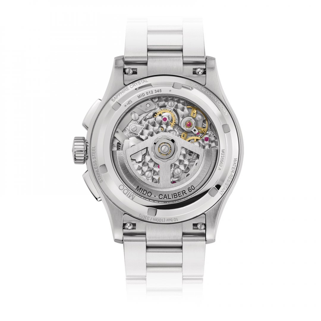 luxury watches Mido Multifort + Naťahovač SAPHIR len za 1 EUR Automatic Chronograph, Water resist 100M, 43 mm. The watch has functions luminescence and Tachymeter scale. Basic parameters of the watch are: strap material is steel, water resistance is 100 m, dial colour is transparent and grey and movement type is mechanical chronograph with automatic winding.