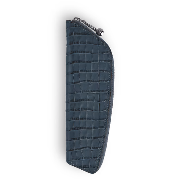 This elegant single pen case combines Montblanc's craftsmanship tradition with modern design. Made from velvet blue leather with a crocodile embossed pattern, it draws on the brand's historic cases and offers a secure, stylish and practical solution for carrying your writing instrument every day. It is ideal for Meisterstück Classique or LeGrand models, but thanks to its universal shape, it can accommodate most luxury pens.