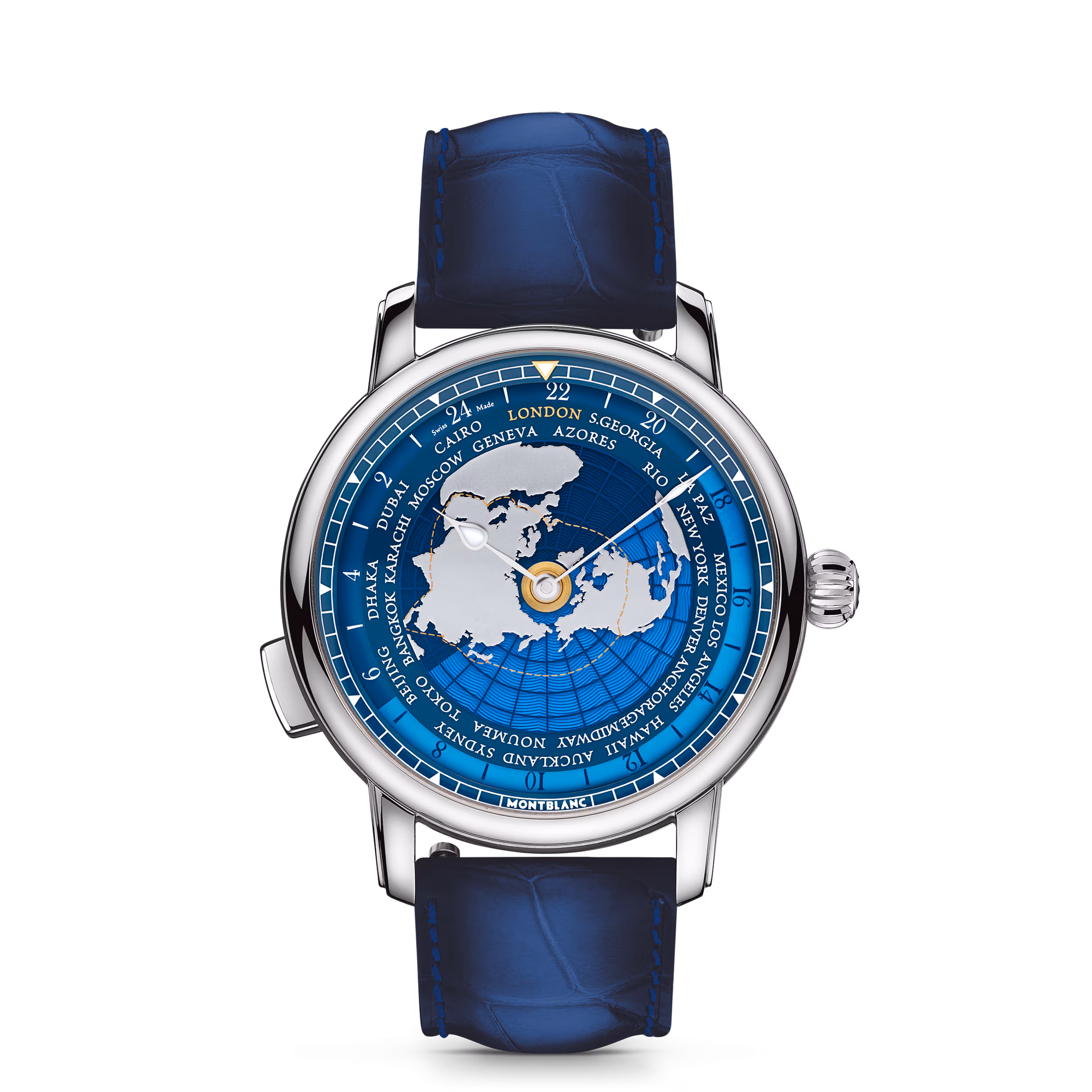 luxury watches Montblanc Star Legacy ORBIS TERRARUM AROUND THE WORLD IN 80 DAYS LIMITED EDITION - 360 PIECES Automatic, 43 mm, LE 360 pcs. The watch has functions world times. Basic parameters of the watch are: dial colour is silver and blue, movement type is mechanical watch with automatic winding, strap material is leather and water resistance is 50 m.
