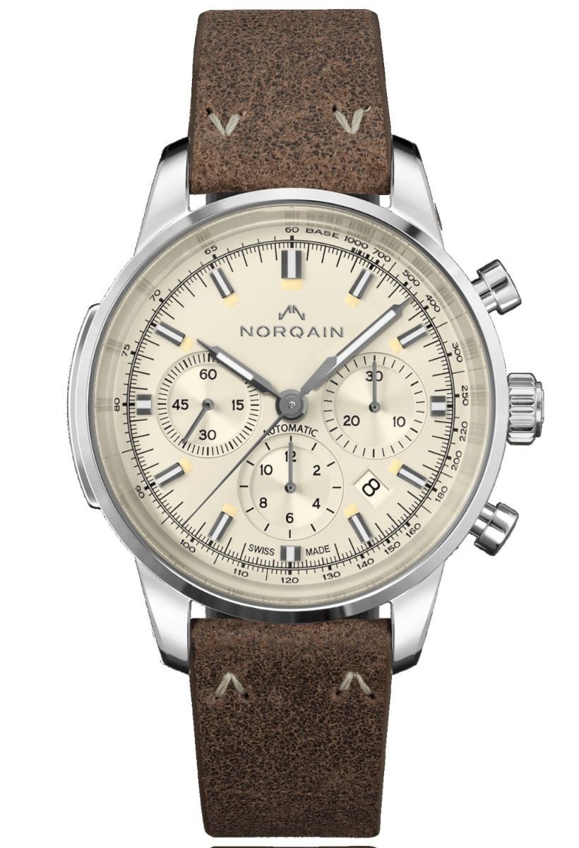 luxury watches Norquain FREEDOM Automatic Chronograph, Water resist 100M, 43 mm. The watch has functions luminescence, stopwatch and date . Basic parameters of the watch are: movement type is mechanical chronograph with automatic winding, strap material is leather, water resistance is 100 m and dial colour is beige.