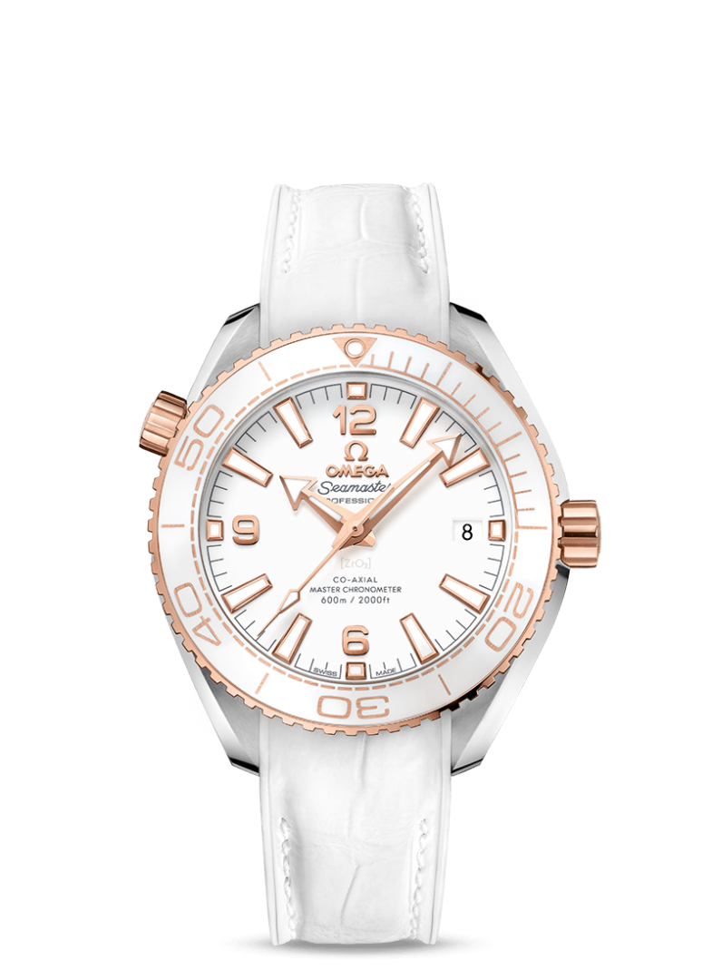 luxury watches Omega Seamaster Planet Ocean 600M Gold, Automatic, 37.5 mm. The watch has functions Helium release valve, luminescence and date . Basic parameters of the watch are: dial colour is white, strap material is leather, water resistance is 600 m and movement type is mechanical watch with automatic winding.