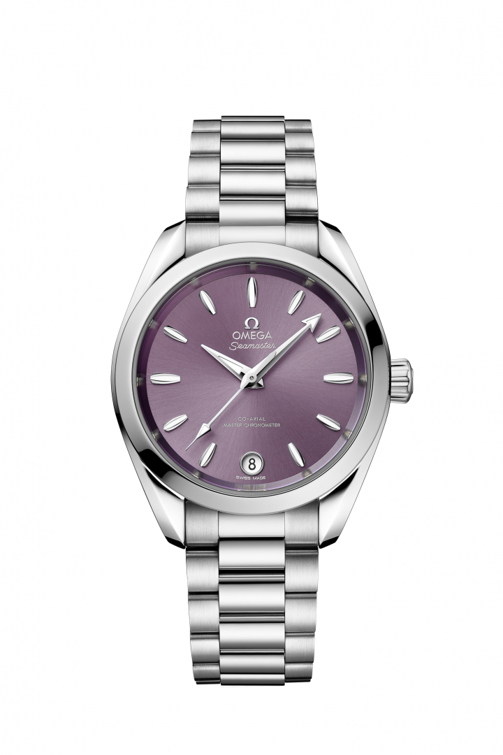 luxury watches Omega Seamaster Aqua Terra 150M In-house calibre, 34 mm. The watch has functions luminescence and date . Basic parameters of the watch are: movement type is mechanical watch with automatic winding, strap material is steel, water resistance is 150 m and dial colour is purple.