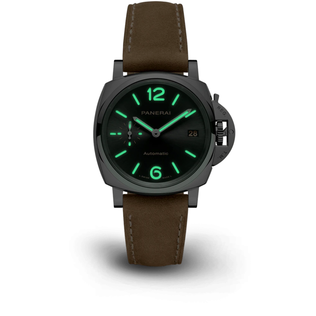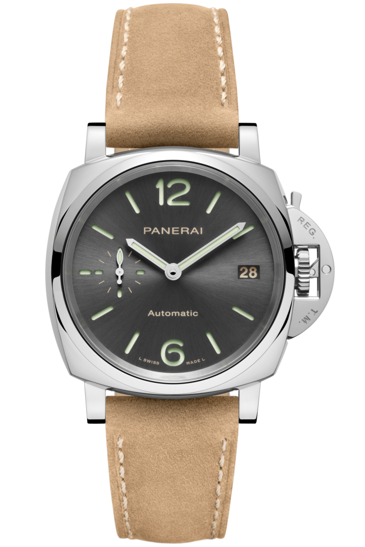 luxury watches Panerai Luminor Due In-house calibre, 38mm. The watch has functions luminescence and date . Basic parameters of the watch are: dial colour is grey, movement type is mechanical watch with automatic winding, strap material is leather and water resistance is 30 m.