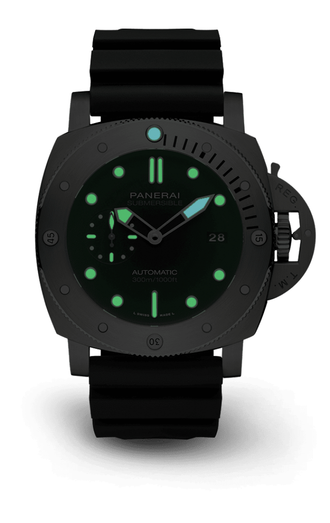 Luxury watches Panerai Submersible Manufaktúrni kalibr, Vode odolnosť 300M, 47 mm. The watch has functions luminescence and date . Basic parameters of the watch are: dial colour is black, movement type is mechanical watch with automatic winding, strap material is rubber and water resistance is 300 m.