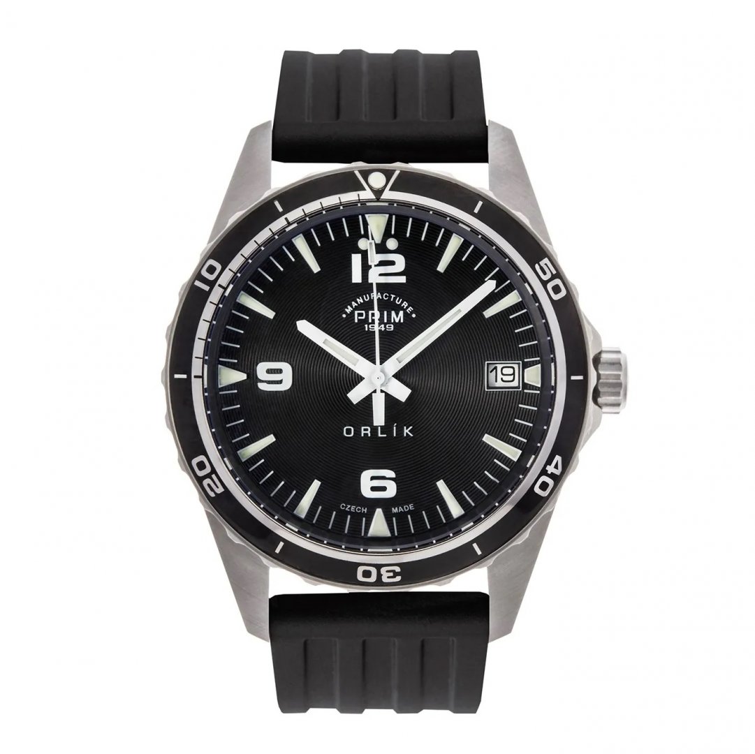 luxury watches Prim Manufacture Orlík II C In-house movement, 42 mm. The watch has functions luminescence and date . Basic parameters of the watch are: dial colour is black, movement type is mechanical watch with automatic winding, strap material is rubber and water resistance is 100 m.