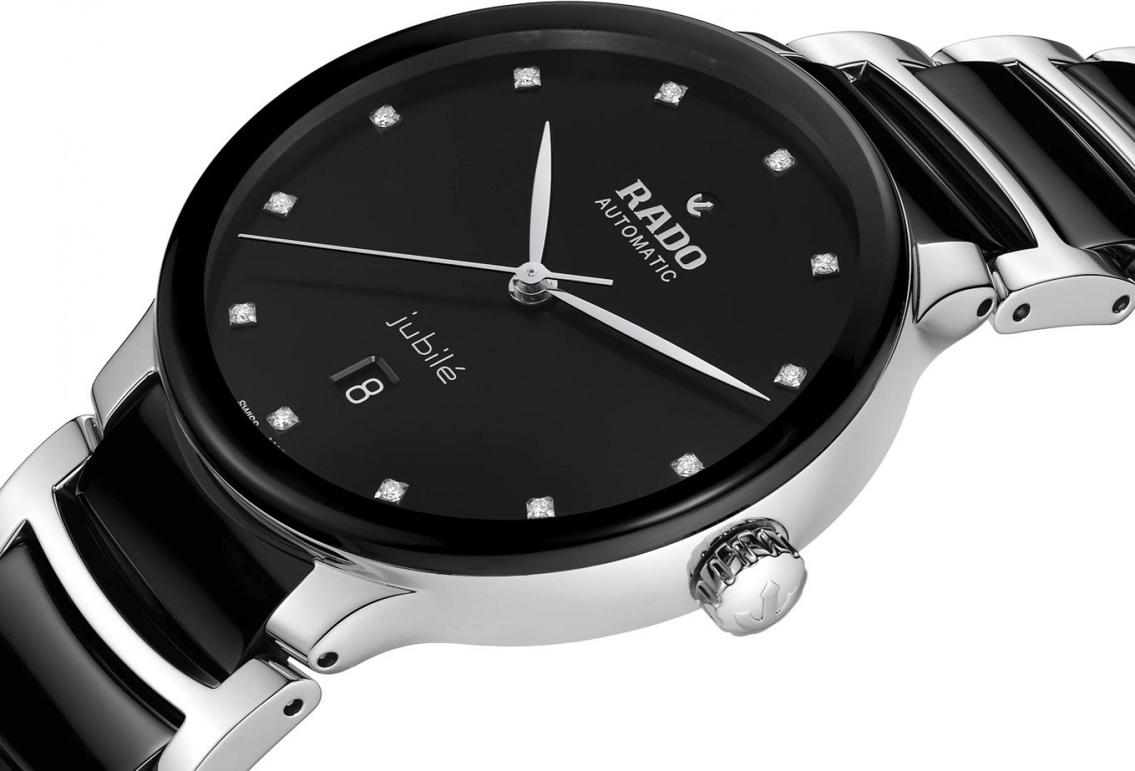 luxury watches Rado Centrix Diamonds, Automatic, 39.50 mm. The watch has functions date . Basic parameters of the watch are: movement type is mechanical watch with automatic winding, strap material is ceramics and steel, water resistance is 50 m and dial colour is black.