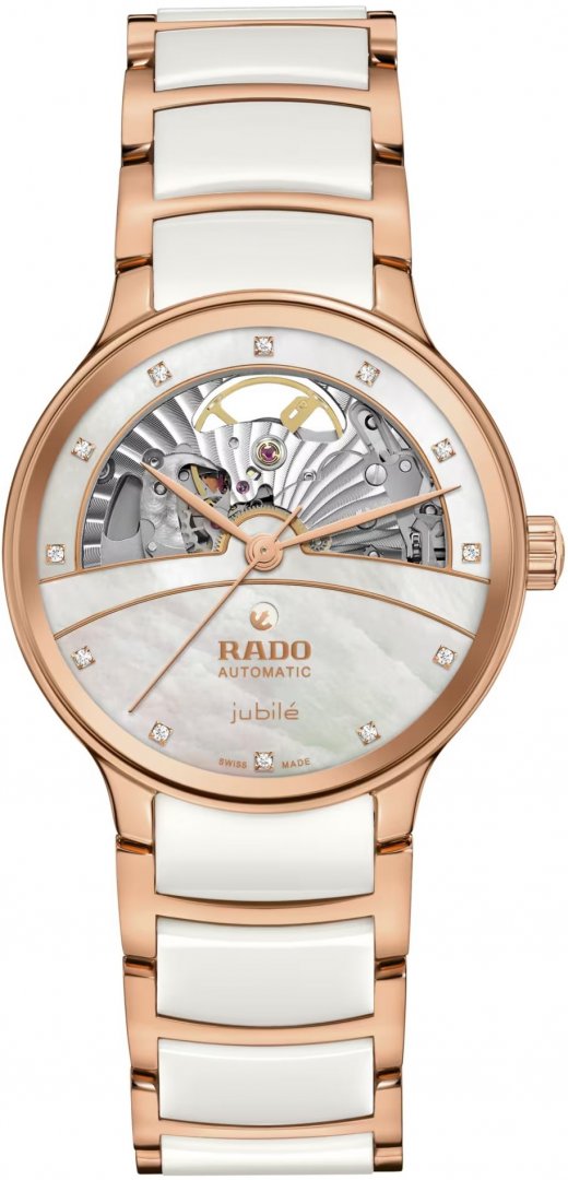 luxury watches Rado Centrix Diamonds, Automatic, 35 mm. Basic parameters of the watch are: movement type is mechanical watch with automatic winding, strap material is steel and ceramics, water resistance is 50 m and dial colour is white and transparent.