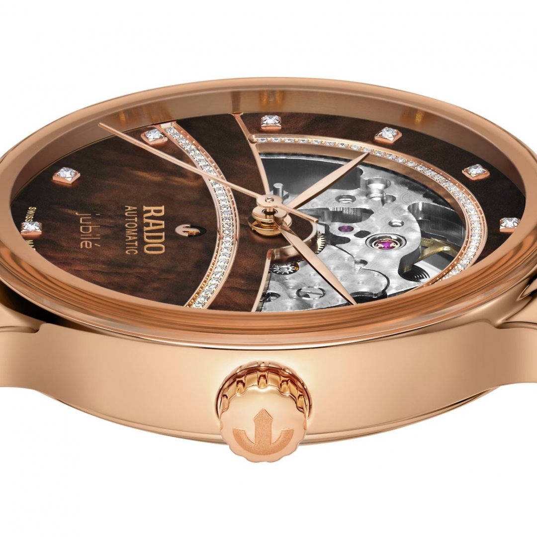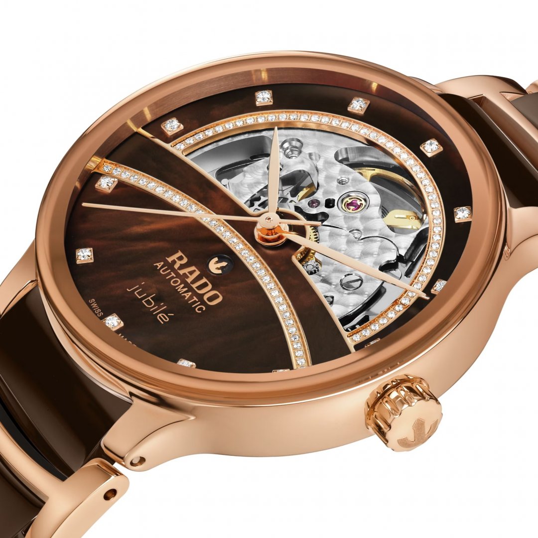 luxury watches Rado Centrix Diamonds, Automatic, 35 mm. Basic parameters of the watch are: movement type is mechanical watch with automatic winding, water resistance is 50 m, strap material is ceramics and titanium and dial colour is transparent and brown.