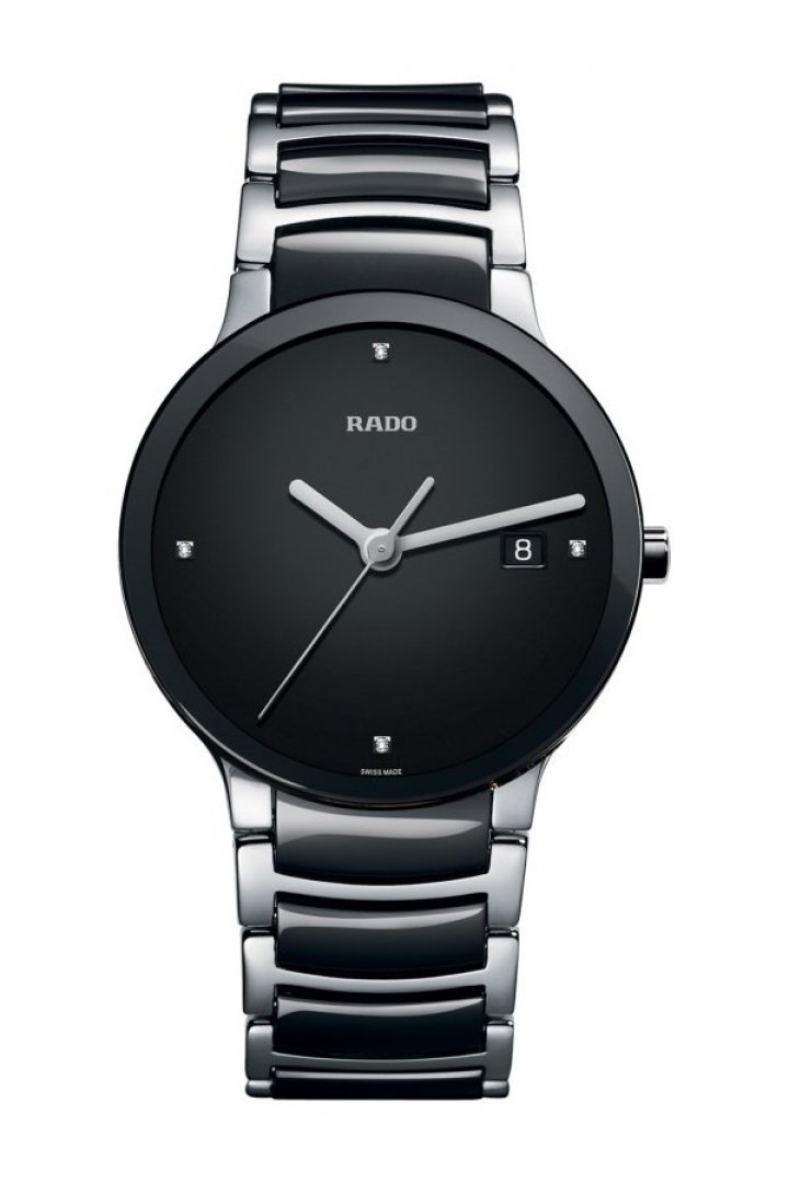 luxury watches Rado Centrix Diamonds, Quartz, 38 mm. The watch has functions date and E.O.L.. Basic parameters of the watch are: dial colour is black, movement type is Quartz watches, strap material is ceramics, steel and titanium and water resistance is 30 m.