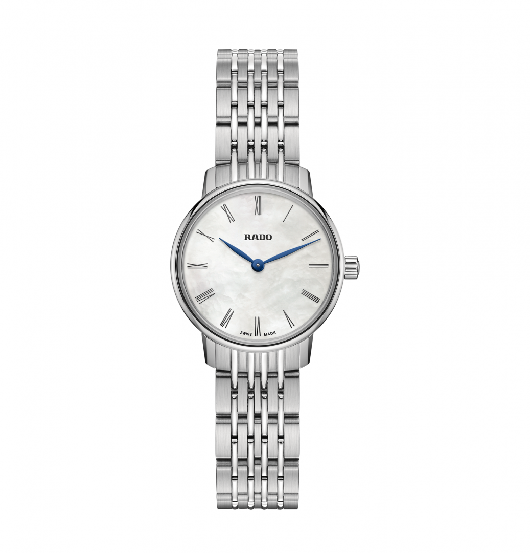 Luxury watches Rado Coupole Classic . Basic parameters of the watch are: dial colour is pearl, movement type is Quartz watches, strap material is steel and water resistent is 50 m.