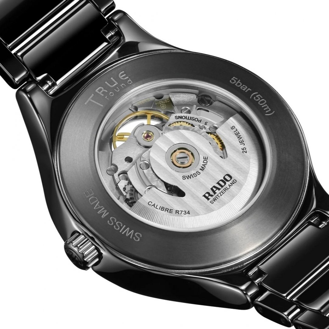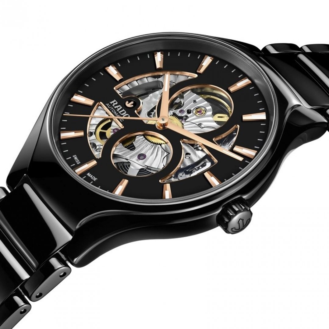 luxury watches Rado True AUTOMATIC OPEN HEART Ceramic, Automatic, 40 mm. The watch has functions luminescence. Basic parameters of the watch are: dial colour is transparent and black, movement type is mechanical watch with automatic winding, water resistance is 50 m and strap material is ceramics.