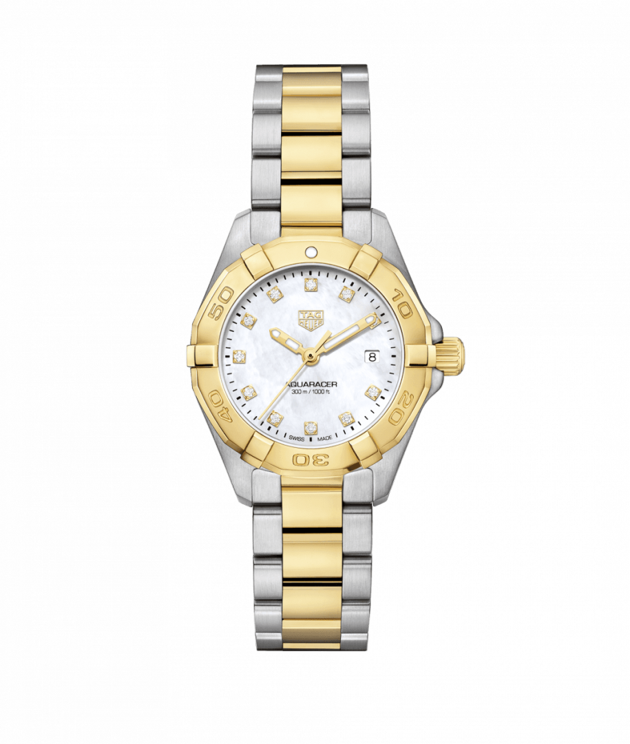 Luxury watches TAG Heuer Aquaracer . The watch has functions luminescence, date and E.O.L.. Basic parameters of the watch are: strap material is steel and gold, water resistent is 300 m, dial colour is pearl and movement type is Quartz watches.