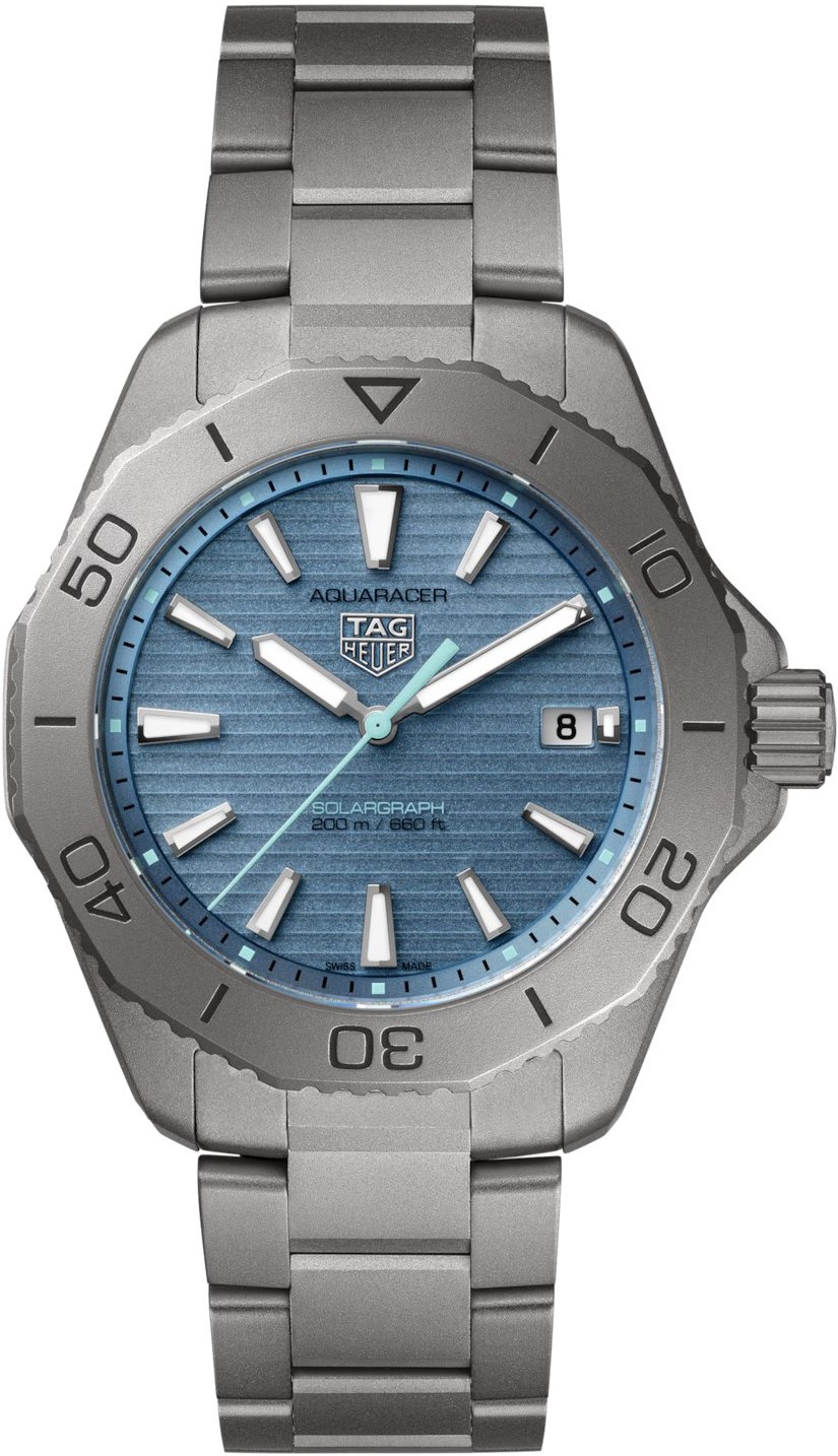 luxury watches TAG Heuer Aquaracer PROFESSIONAL 200 SOLARGRAPH Solar, Water resistance 200M, 40 mm. The watch has functions luminescence and date . Basic parameters of the watch are: movement type is Quartz watches, water resistance is 200 m, dial colour is blue and strap material is titanium.