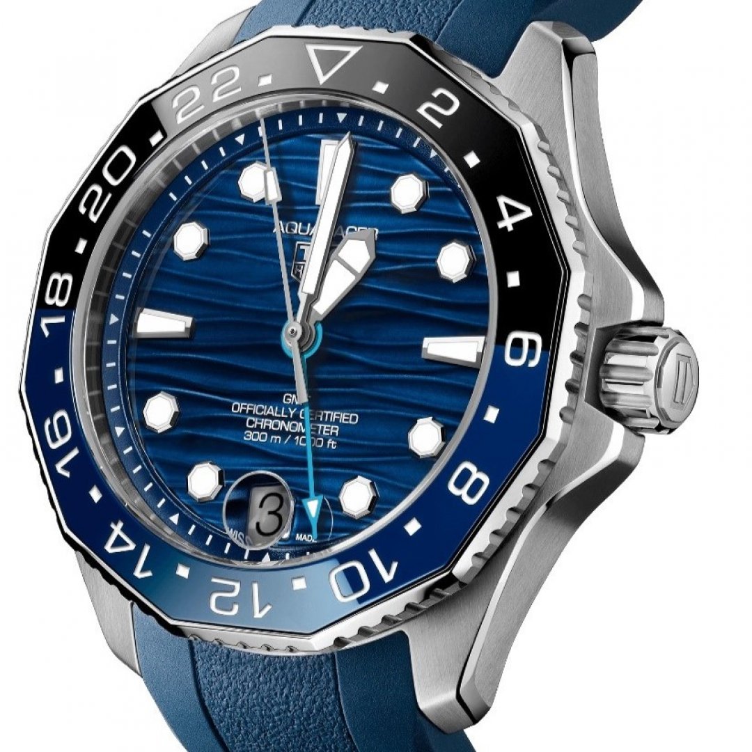luxury watches TAG Heuer Aquaracer PROFESSIONAL 300 GMT Water resistance 300 m, twin-timezone, 42 mm. The watch has functions luminescence, date and dual time. Basic parameters of the watch are: movement type is mechanical watch with automatic winding, water resistance is 300 m, dial colour is blue and strap material is rubber.